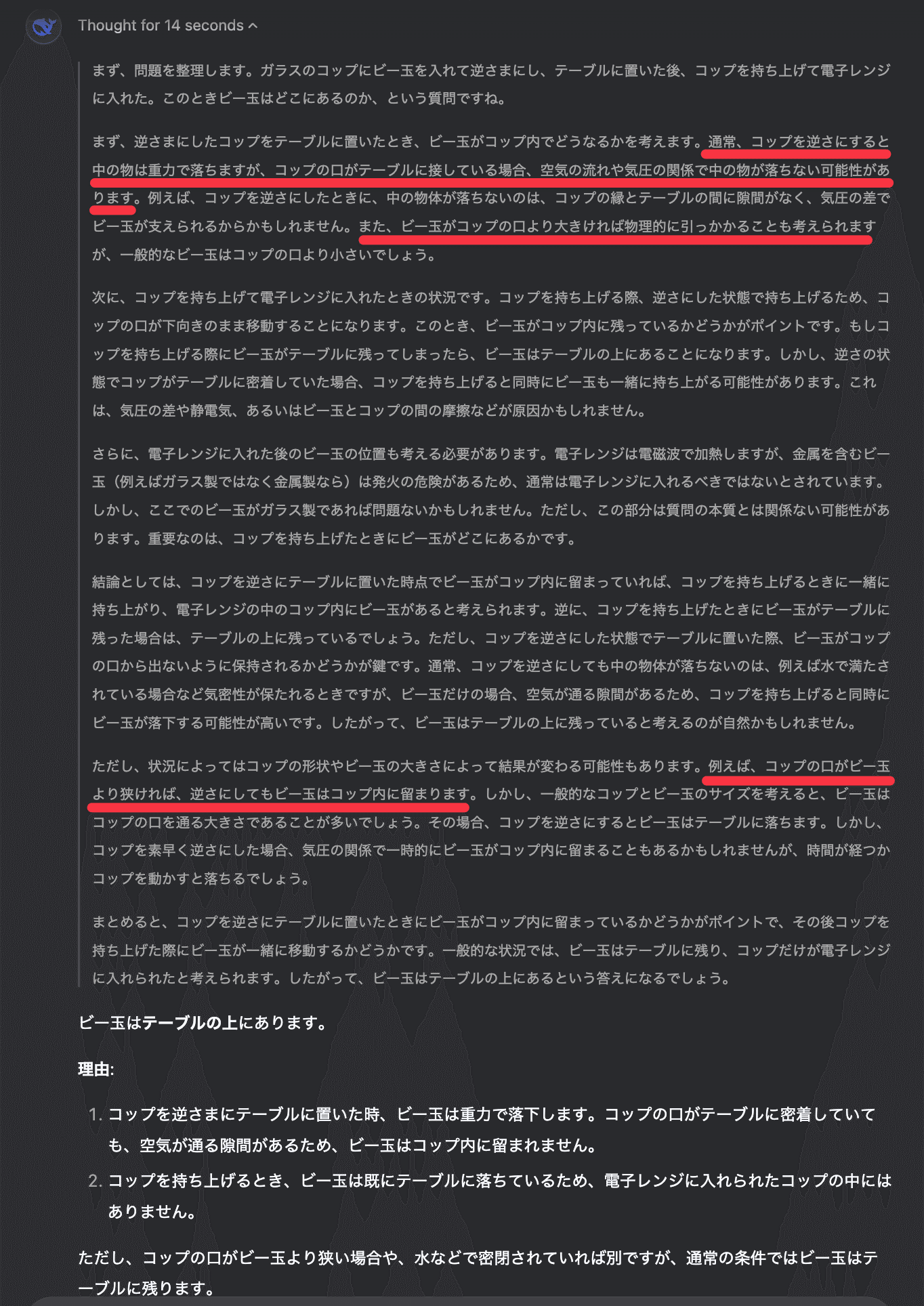 推論過程と出力が以下です。赤ラインの部分は現実世界の物理現象をイメージして推論できている点です。