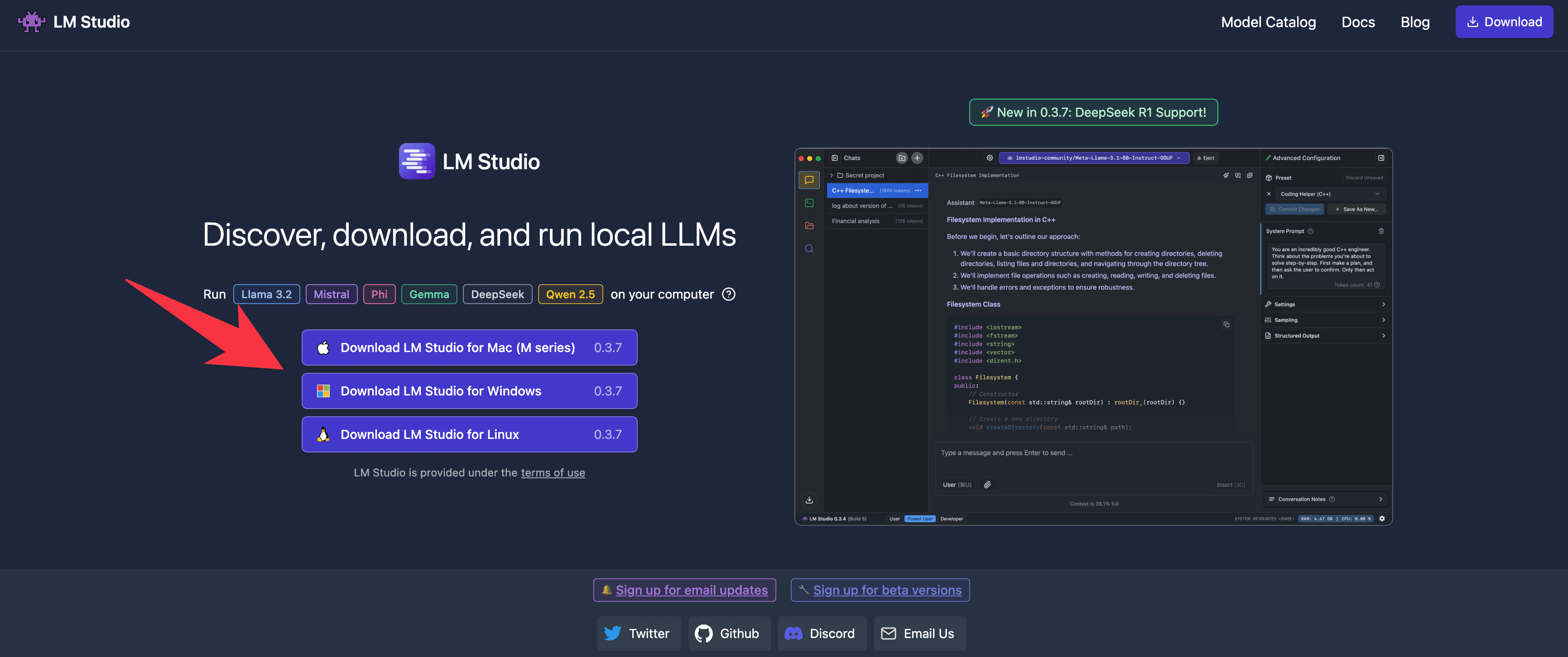 LM Studio公式サイトからインストーラをダウンロードし、指示に従ってインストールします。
