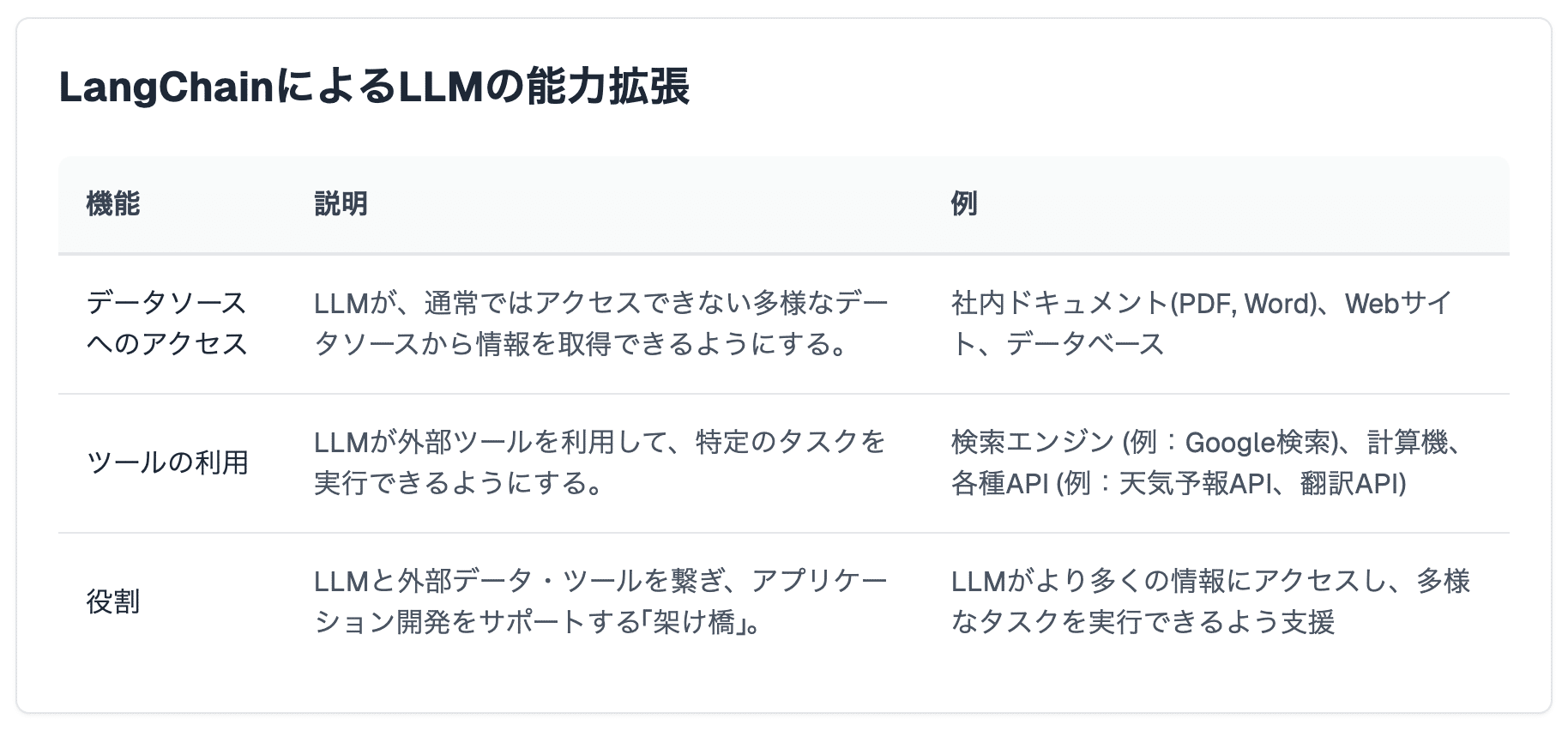 つまり、LangChainは、LLMがより多くの情報にアクセスし、様々なタスクを実行できるようにすることで、LLMの能力を最大限に引き出す役割を担っています。