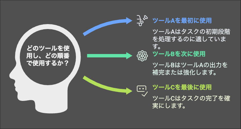 Agentsは、複数のツールを組み合わせて、複雑なタスクを実行する仕組みです。LLMが、どのツールを、どの順番で使うかを判断します。