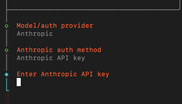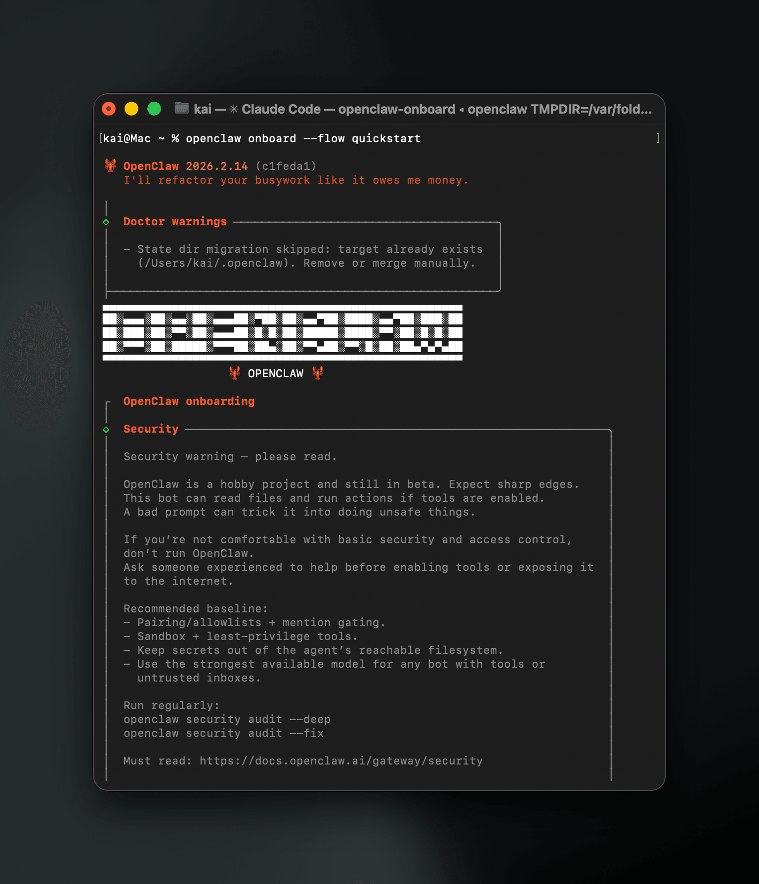 openclaw onboard --flow quickstart対話形式で初期設定が進みます。AIモデルのトークン登録もこのステップです。