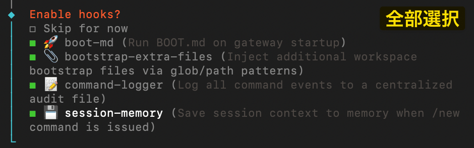オンボーディング中に、Hooks を有効にするか聞かれます。有効にしておくと、セッションメモリの自動保存やboot時の設定読み込みなど、運用が楽になります。メッセージ受信やcron自体はGatewayの機能として動くので必須ではありませんが、推奨です。(選択はspaceキーです)