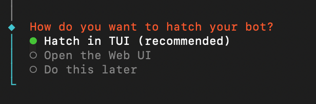 オンボーディングが終わると、TUI(ターミナル画面)に「Hatch」の選択肢が出ます。選ぶとエージェントが起動します。最初の会話です。
