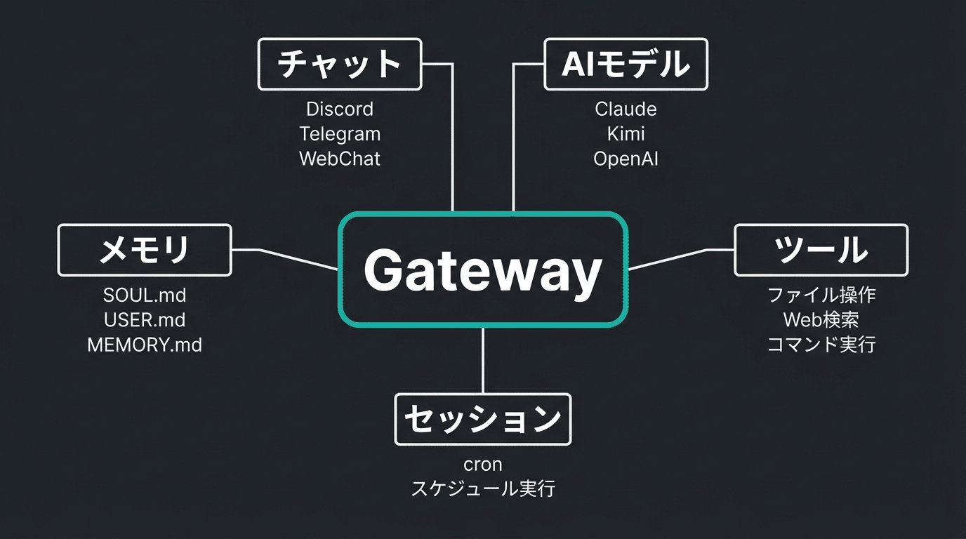 チャット面、AIモデル、ツール、メモリ、セッション管理を束ねる役割を担います。Gatewayが動いている限り、AIはいつでも応答できる状態で、逆にGatewayが止まると、すべてが止まります。OpenClawの運用は、このプロセスを安定させることがほぼすべてです。