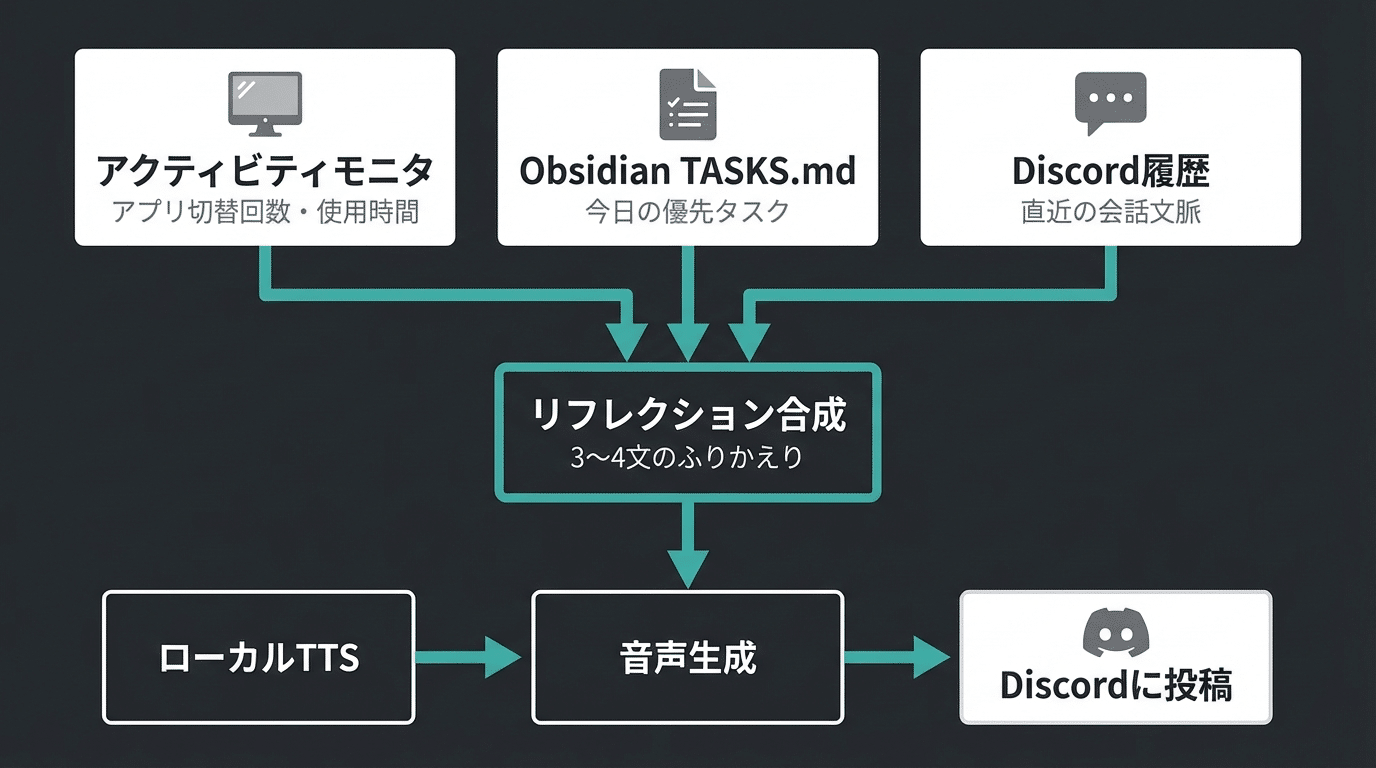 この3つのデータを統合し、エージェントが3〜4文のリフレクションを生成。ローカルのTTSエンジン(Qwen3-TTS-MLX)で音声に変換し、Discordにテキストと音声で投稿します。