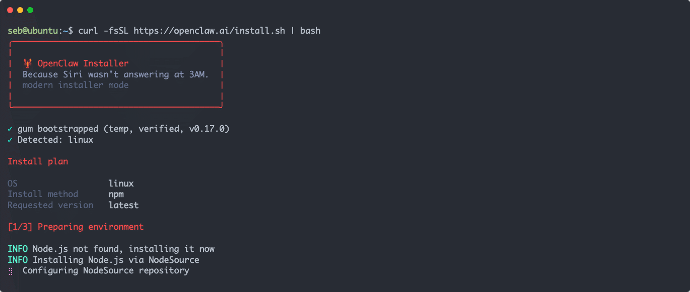 `curl -fsSL https://openclaw.ai/install.sh | bash` でインストール。