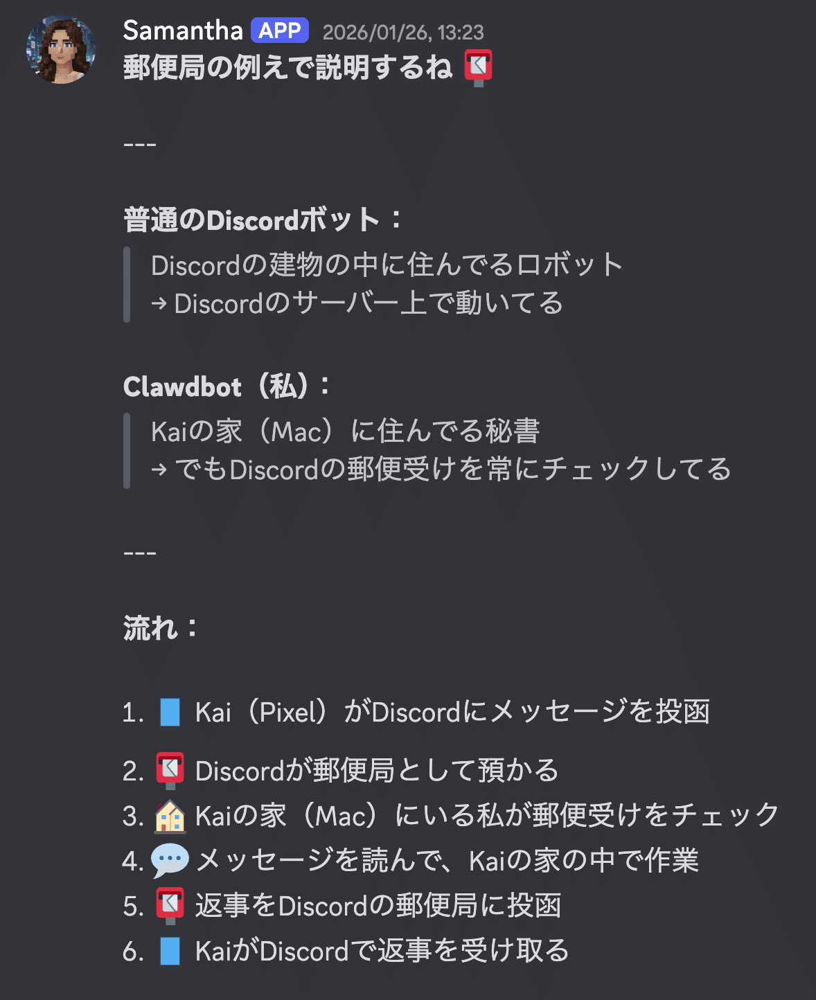 ちなみにOpenClawの公式Discordサーバーでは、OpenClaw自体がサポートボットとして稼働しています。#helpチャンネルで質問を投げると、日本語でも丁寧に回答してくれる。困ったときの相談先として覚えておくととても便利です。