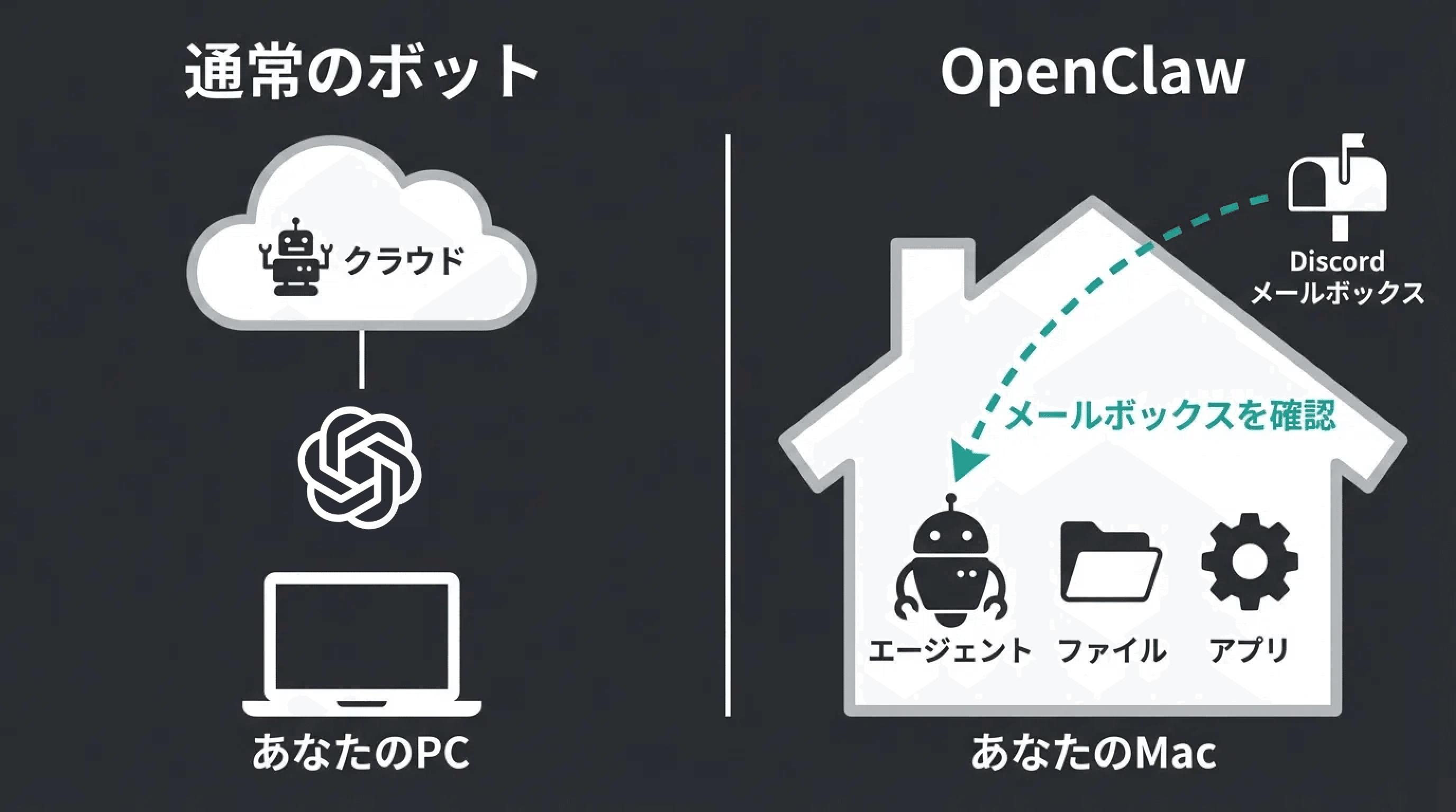 OpenClawは逆で、自分のMacやサーバーの中に住みこみファイルを読み、例えばアプリの使用履歴などを確認し、コマンドを実行できます。