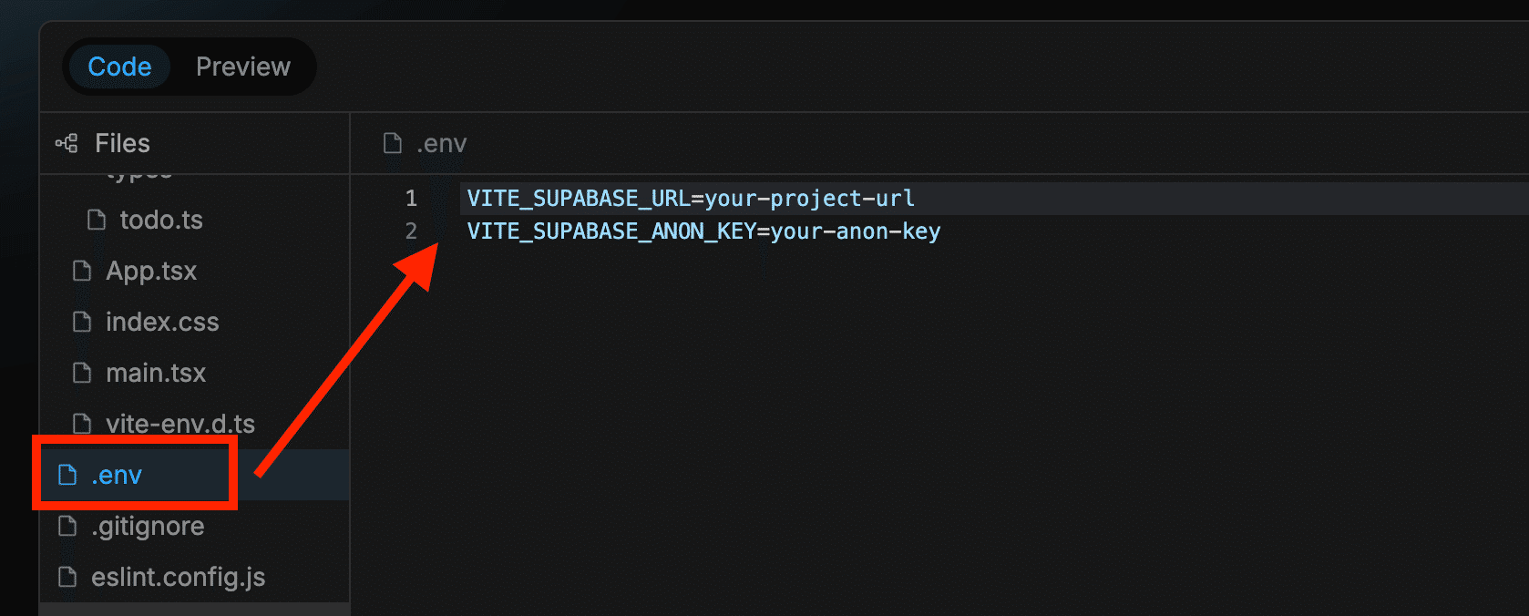.envファイルが作成されるので、そこに先ほどコピーしたProject URL、Project API Keys(anon pubplic)をペーストします。