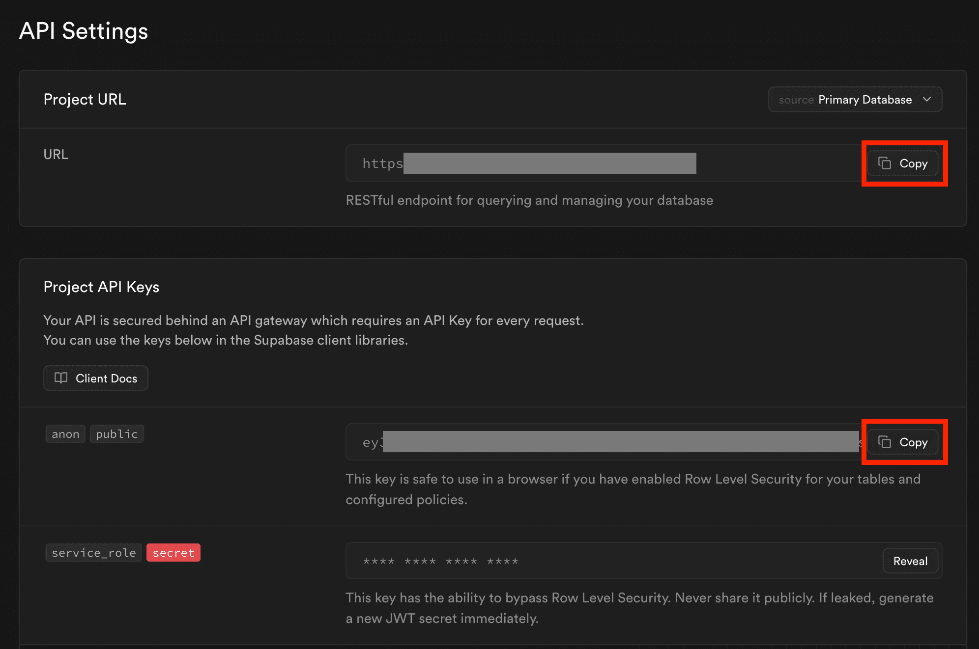 Supabaseダッシュボードで、作成したプロジェクトの"Project Settings" > "API" > "Connect" から、Project URL、Project API Keys(anon pubplic)をコピーします。