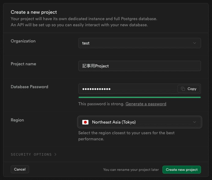 プロジェクト名、パスワード、そしてサーバーの設置場所(Region)を選択します。