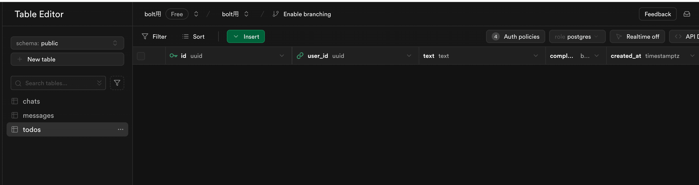 Bolt.newで新しいプロジェクトを作成します。「Todoアプリを作成してください。」のようなプロンプトで、ベースとなるUIを生成させます。