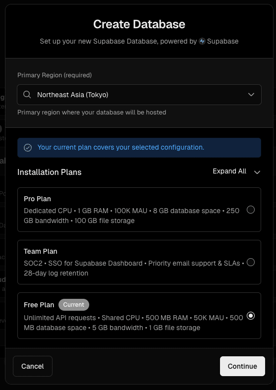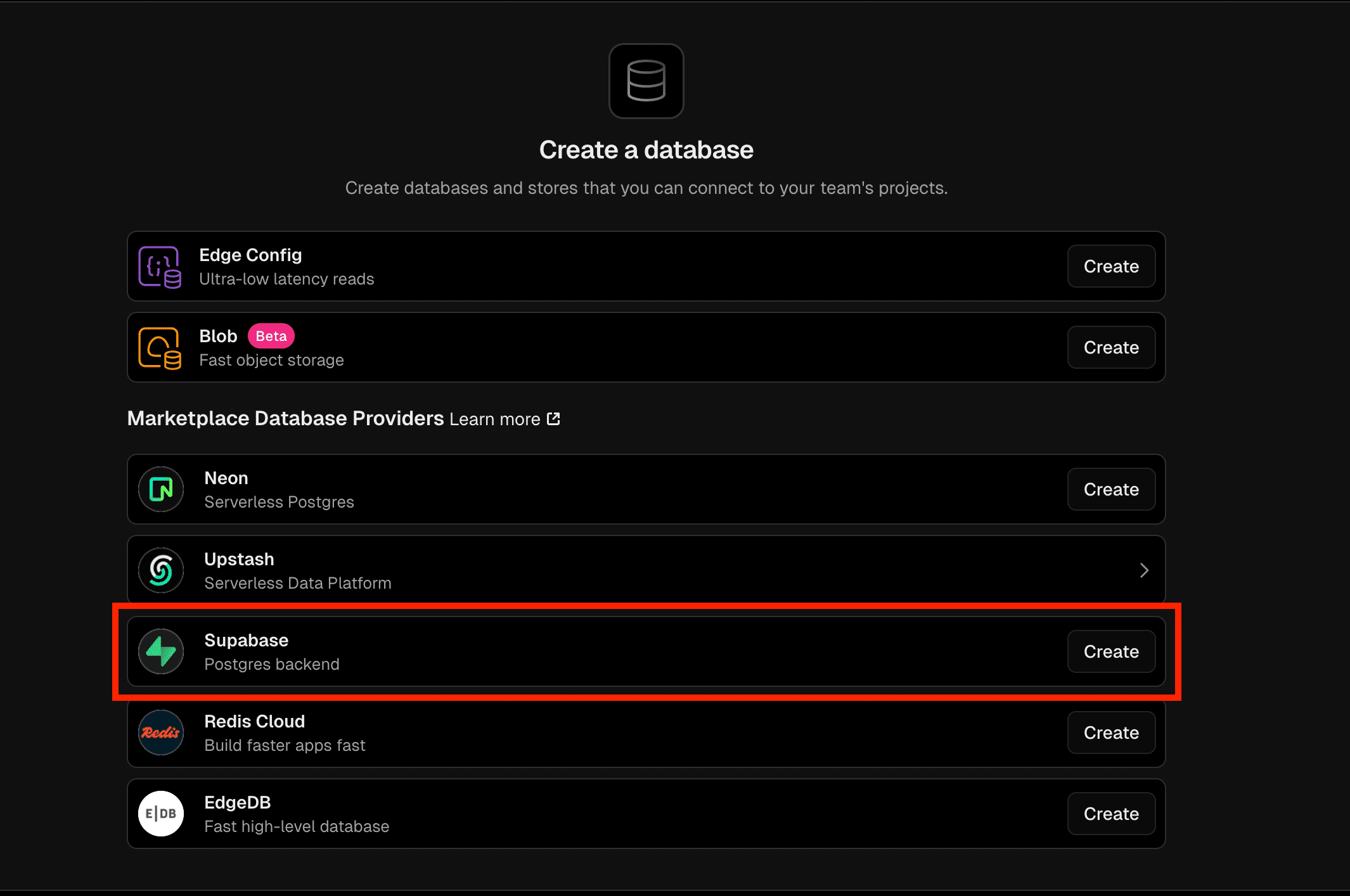 「Create Database」をクリックして、「Supabase」の「Create」をクリックします。