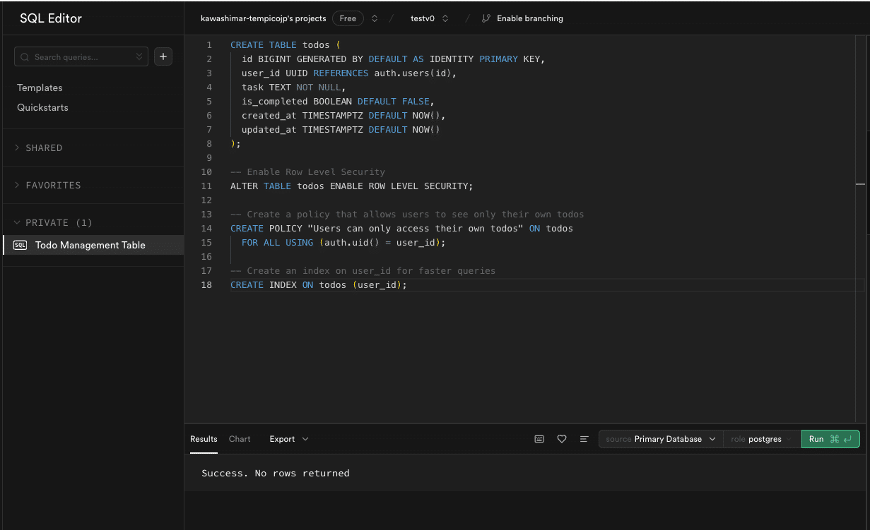 v0の時と同様に、SupabaseのSQL Editorにスキーマをコピーペーストして、Runをクリックすると、テーブルが作成されます。