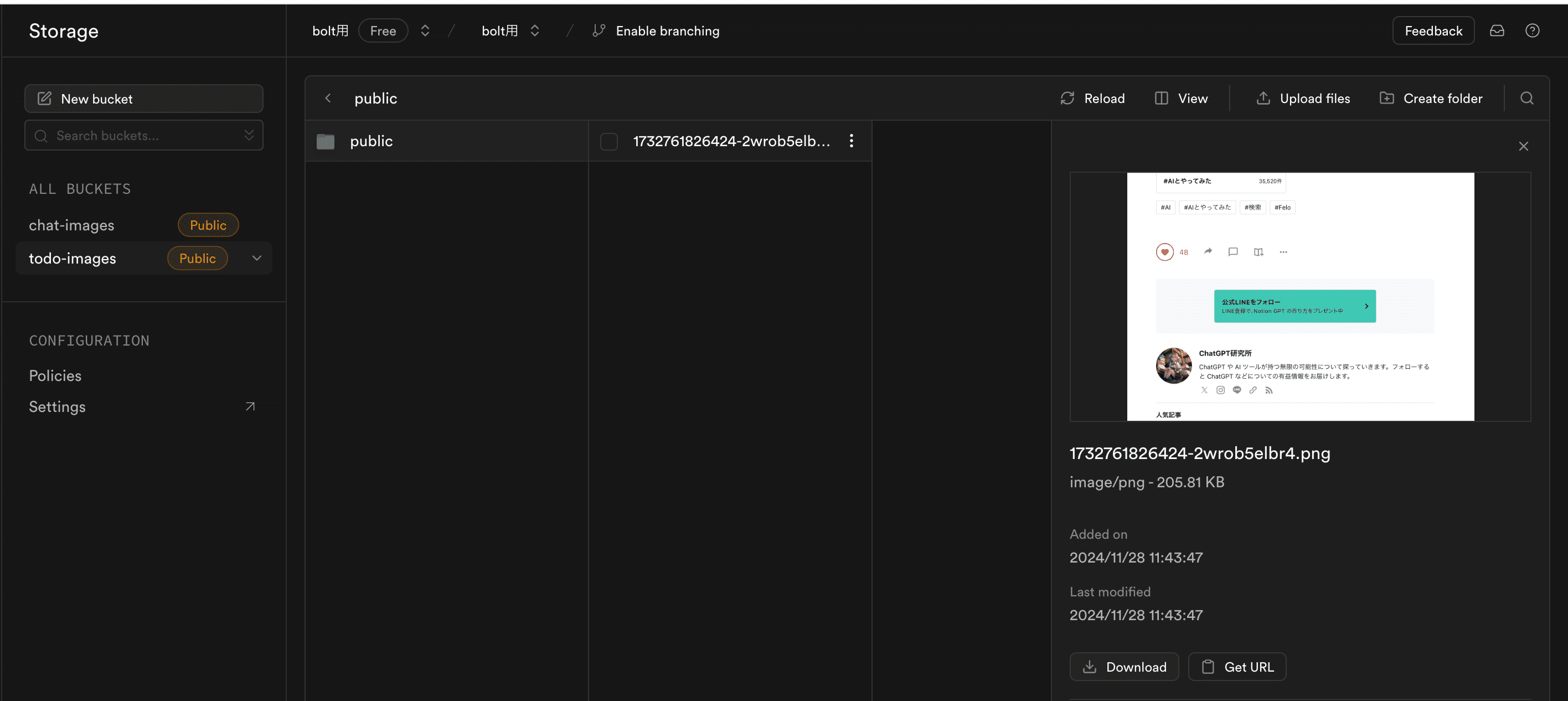Boltのプレビュー画面から画像をアップロード、「追加ボタン」を押して、SupabaseのStorageを確認すると、ちゃんと画像が格納されています。(※エラーが出てしまう場合は、Boltで修正を行なってください)