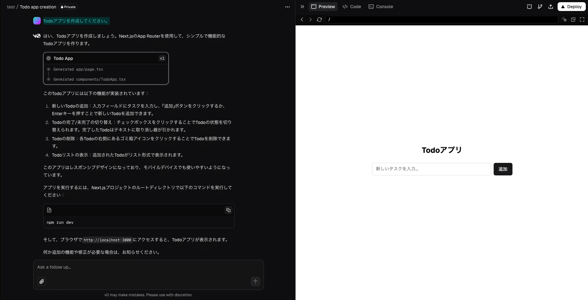 v0のトップ画面に戻って、Supabaseを連携したProjectを選んで、「Todoアプリを作成してください。」と指示してみましょう。