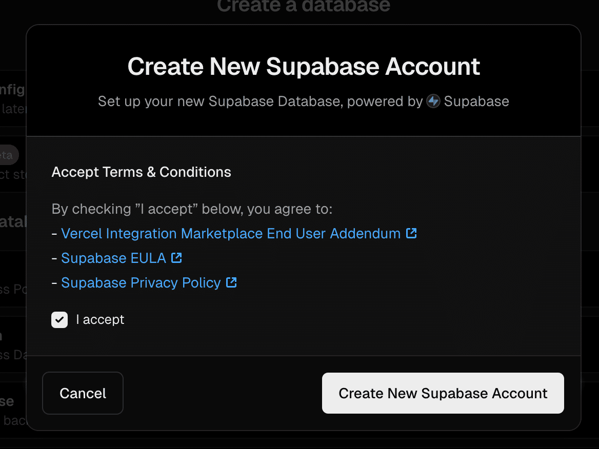 確認画面が出てきたら「I accept」にチェックを入れて「Create New Supabase Account」をクリックします。