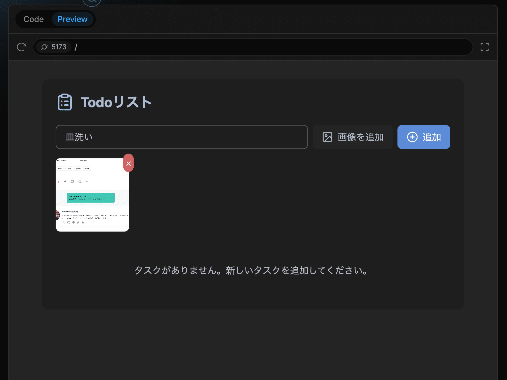 v0に戻って、Preview画面からTodoアプリに、「皿洗い」と追加します。