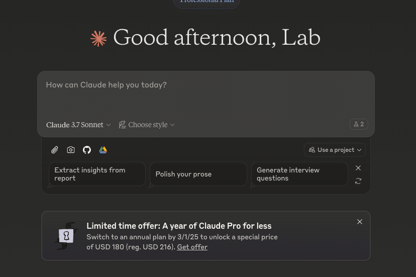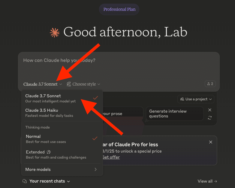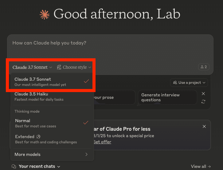 チャット画面の左下にあるモデル選択箇所をクリックして、Claude 3.7 Sonnetを選択します。