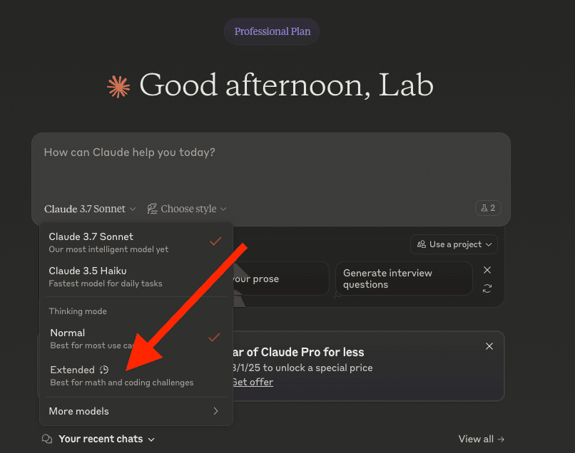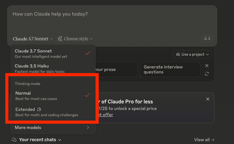 チャット画面の左下から同様に、モデルを選択します。「Extended」を選択すれば使えるようになります。