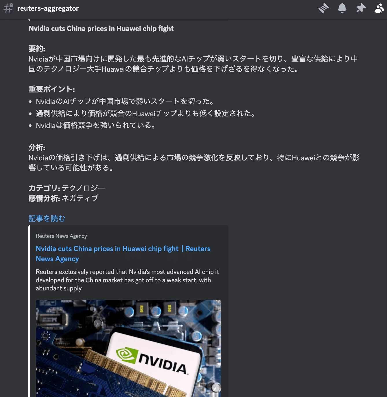 このシステムを応用することで、Reutersに限らず、様々なメディアの最新情報を自動的にDiscordで共有し、最新のニュースや業界動向を迅速に把握することが可能になります。