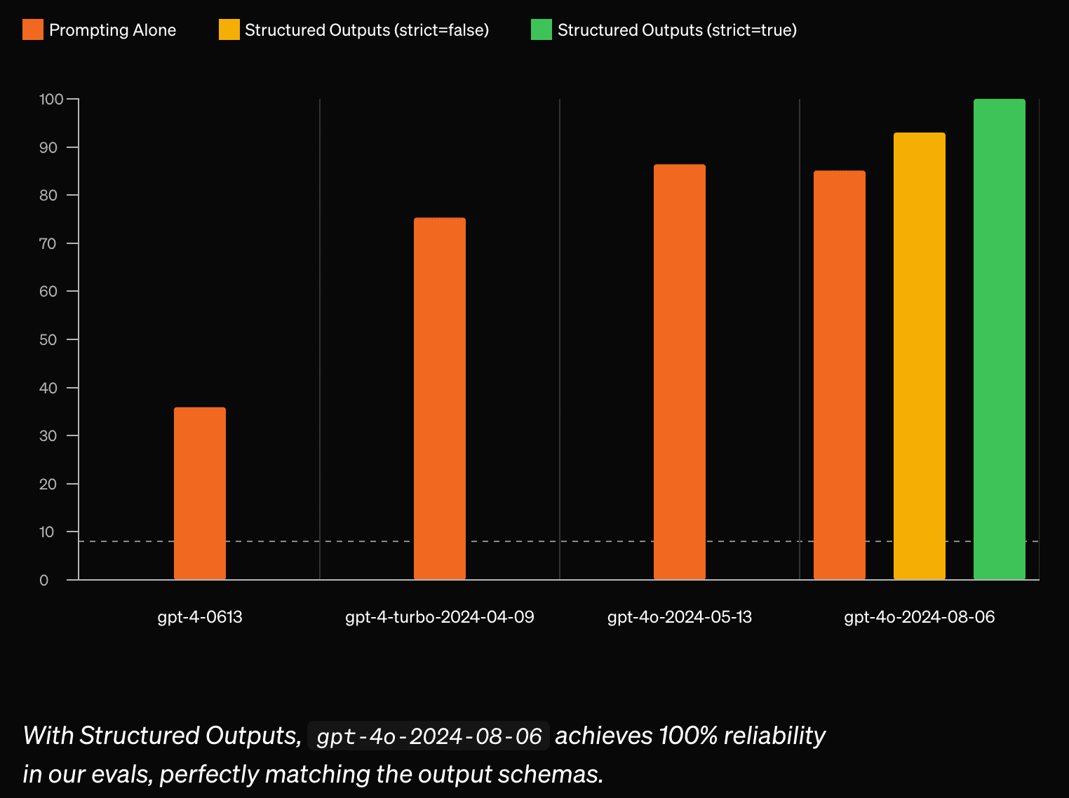 最新モデル「gpt-4o-2024-08-06」では、複雑なJSONスキーマ従順性評価で100%のスコアを達成
