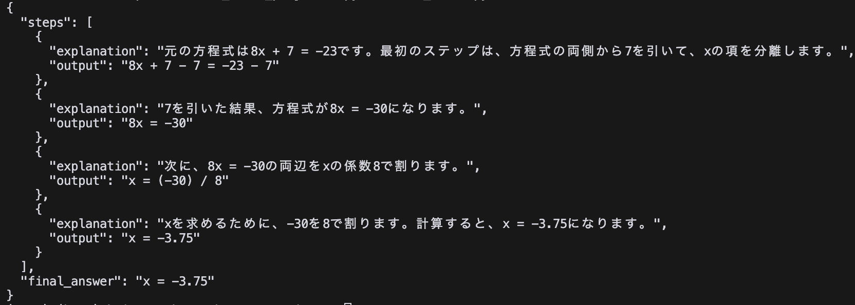 print(json.dumps(math_reasoning.dict(), indent=2, ensure_ascii=False))この例では、Pydanticモデルを`response_format`パラメータに渡すだけで、AIが指定された構造に従った出力を生成します。