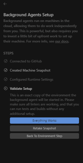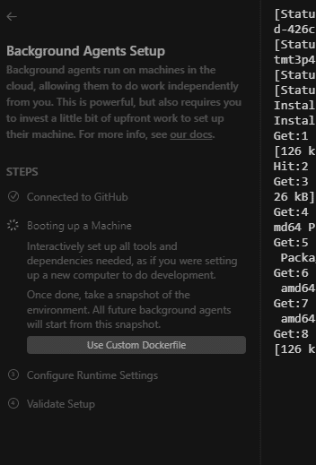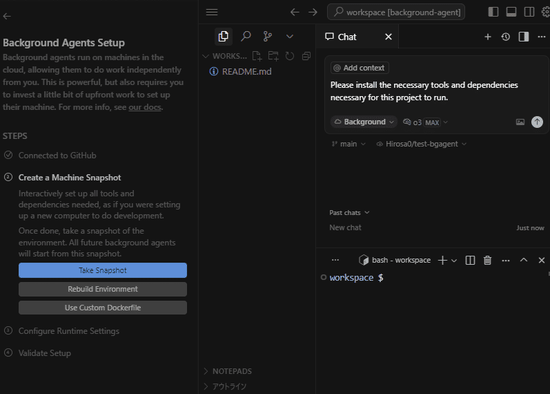エージェントはこれらの設定に基づいてタスクを実行します。特に、開発環境の依存関係が複雑な場合、セットアップに1時間ほどかかることもありますが、初回のセットアップを正しく行うことで、その後のタスク処理がスムーズに進むようになります。