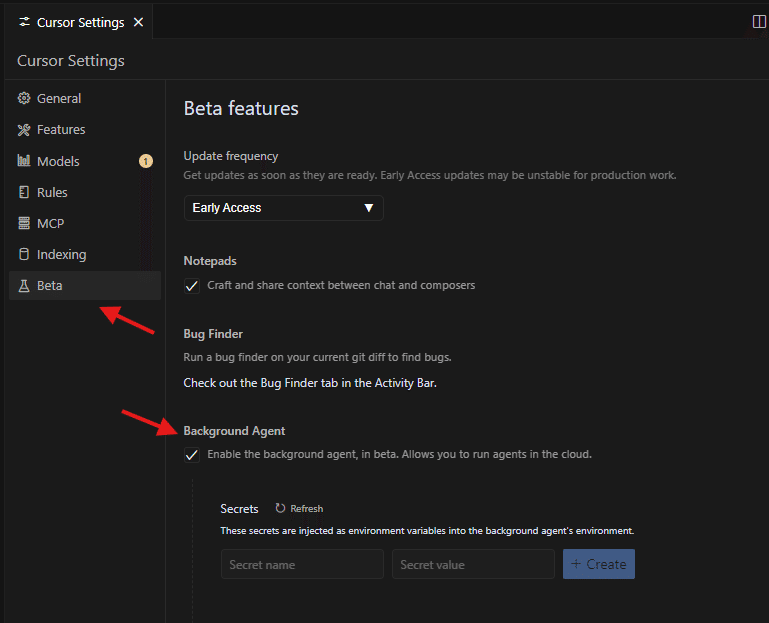 設定画面のBetaを選択→Background Agentにチェックを入れる。