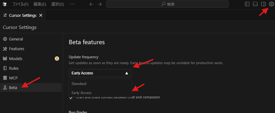 「Beta」を選択し、「Beta features」が「Standard」の場合は「Early Access」に変更します。