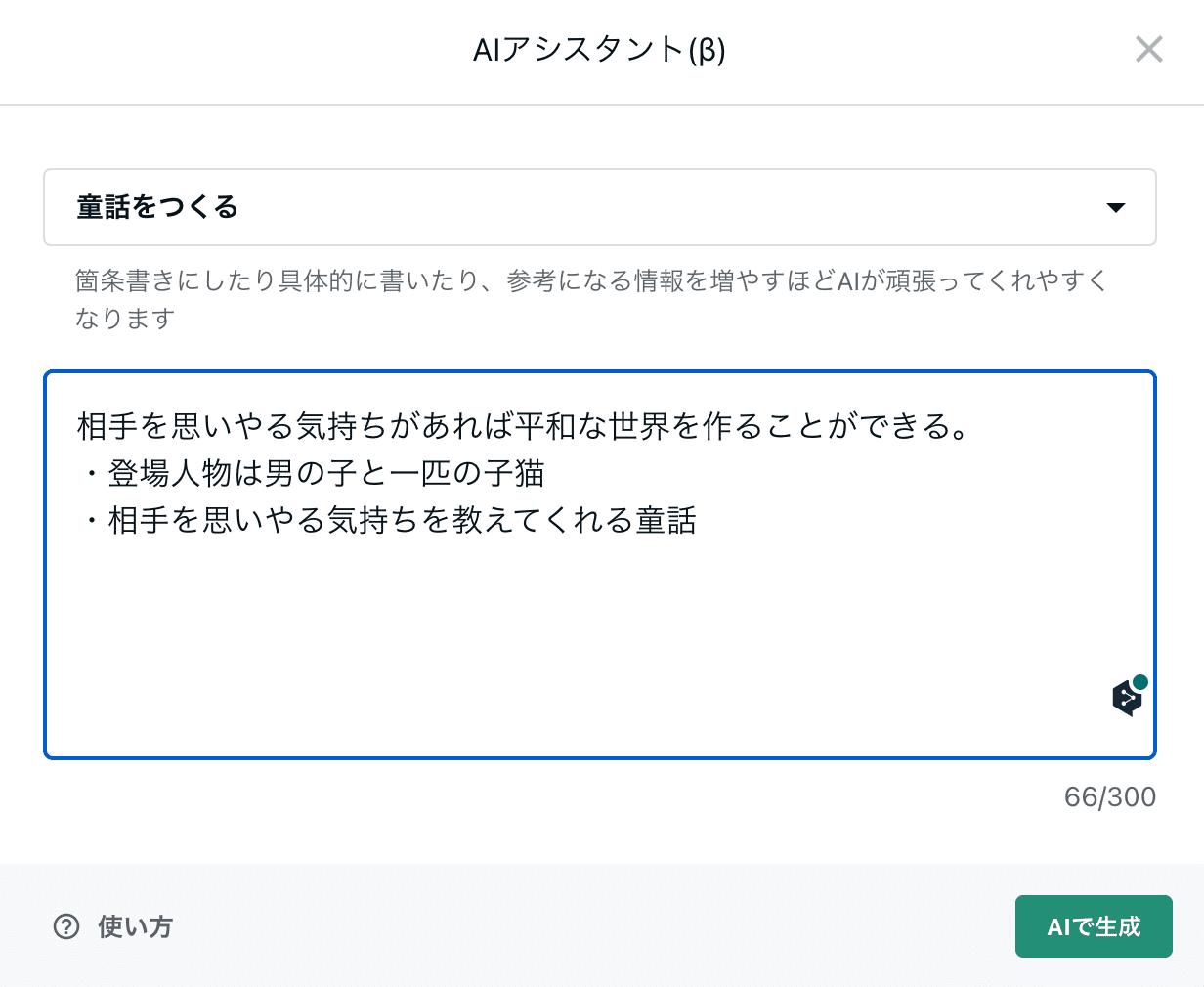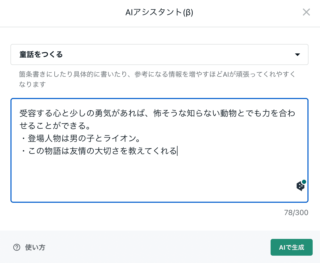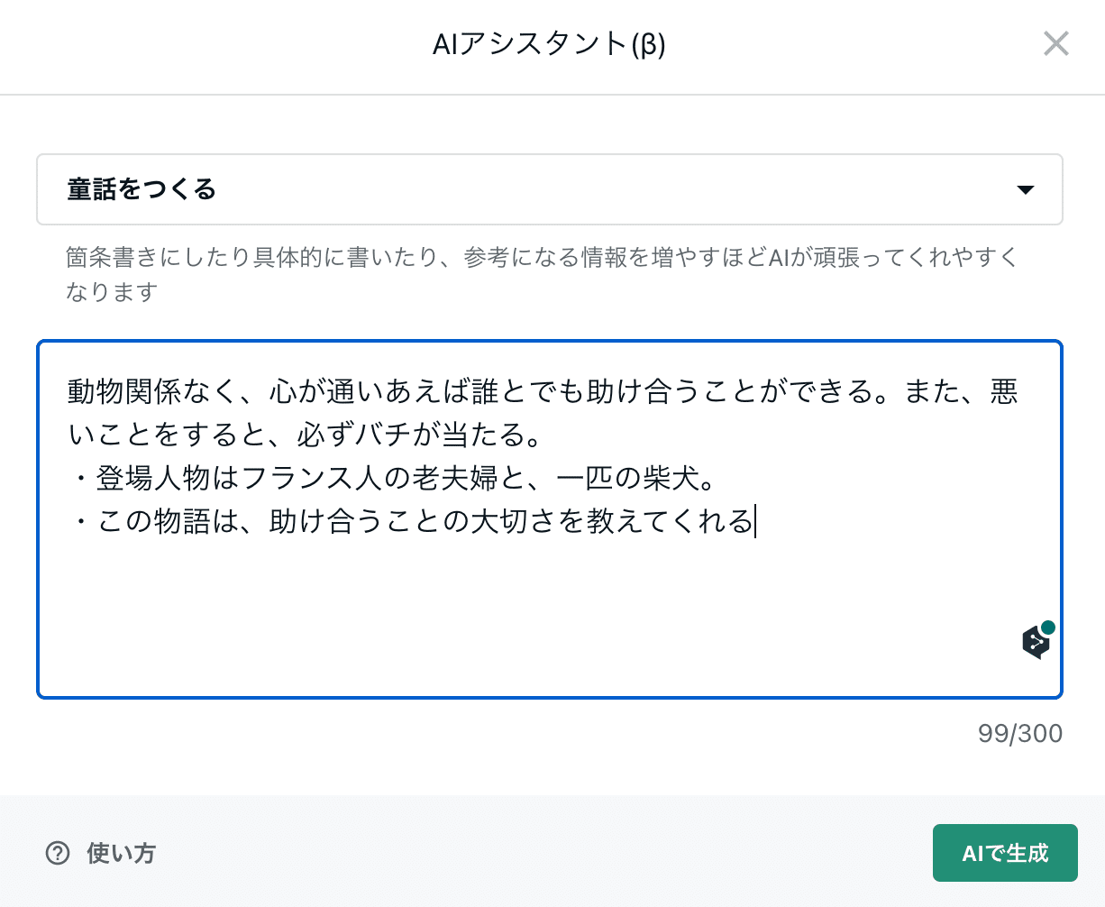 AIアシスタントは次のように、キーワードを入力するだけで、童話を作成してくれます。まずは、デフォルトで用意されている以下のキーワードでどんな童話ができるかを見てみましょう。👉