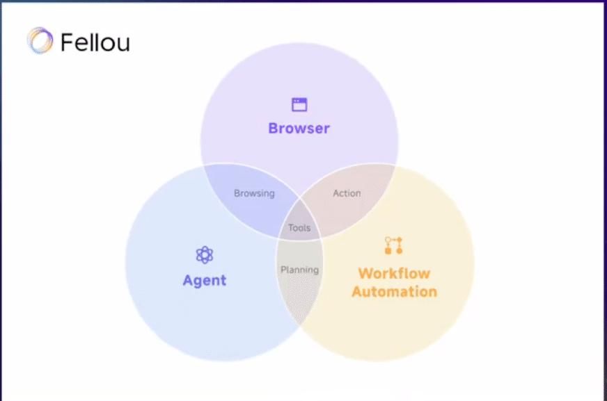 下図はFellouがブラウザ機能・AIエージェント・作業自動化の重なる部分に位置することを示しています。