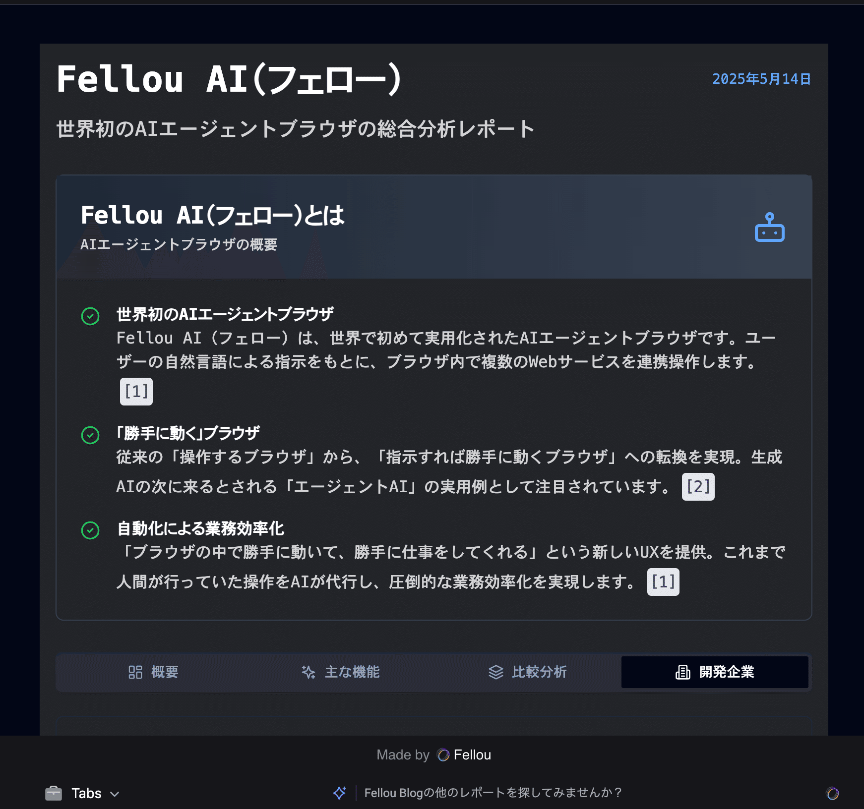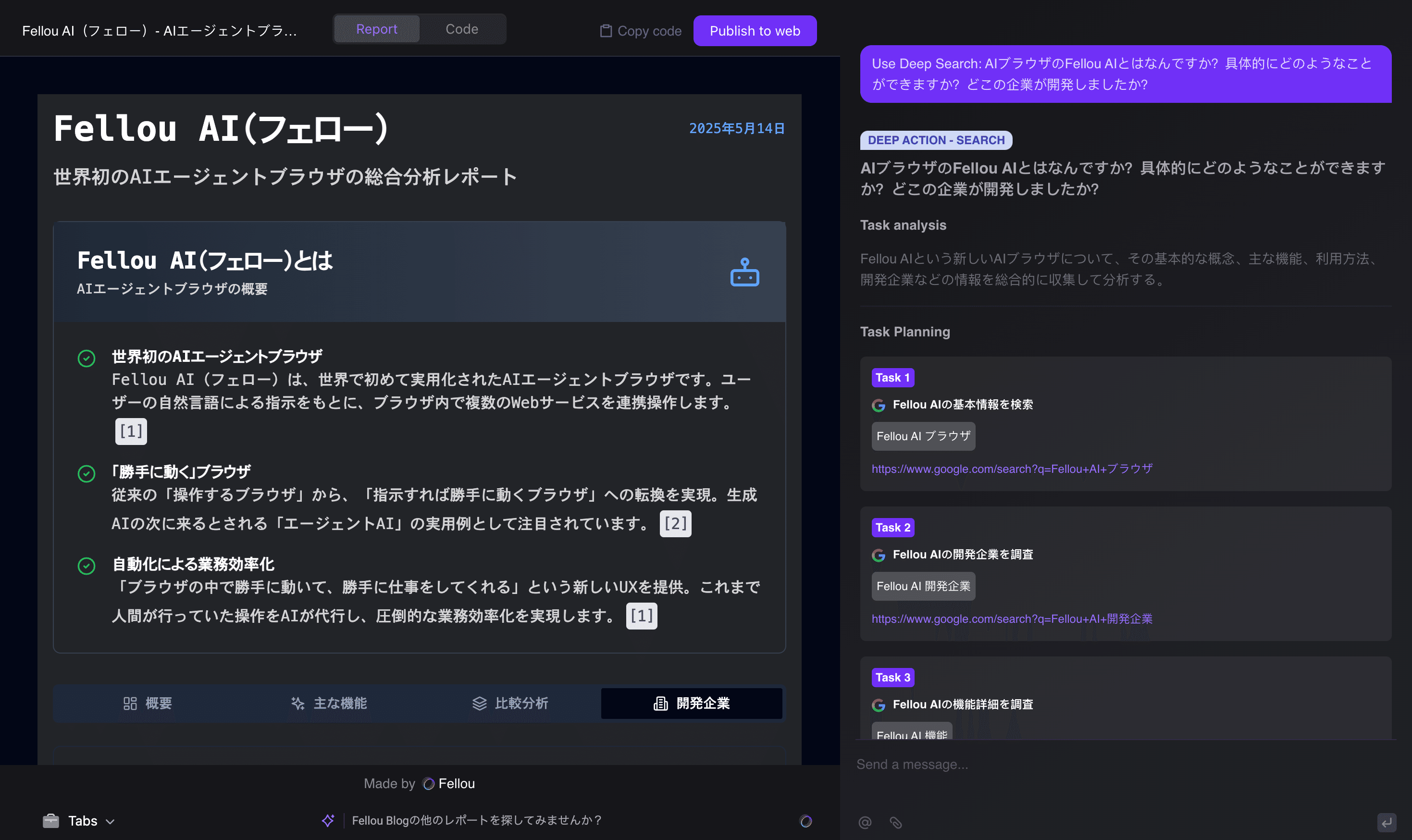 例えば「〇〇について調べてレポートを作って」といった自然言語で命令すれば、Fellouが必要な情報をウェブ上で集め、まとめてくれます。