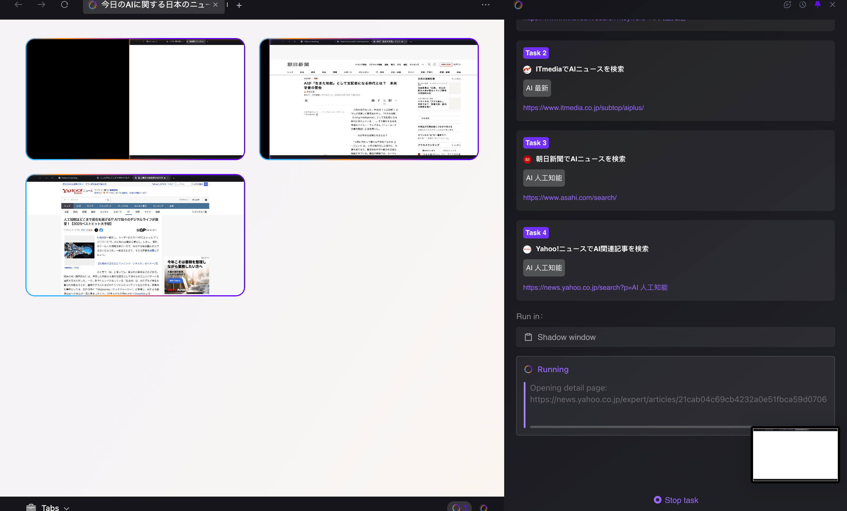 すべての操作履歴は時系列で保存され、振り返りや再利用が可能です。調査やタスクは影のウィンドウで進むため、画面が煩雑になりません。