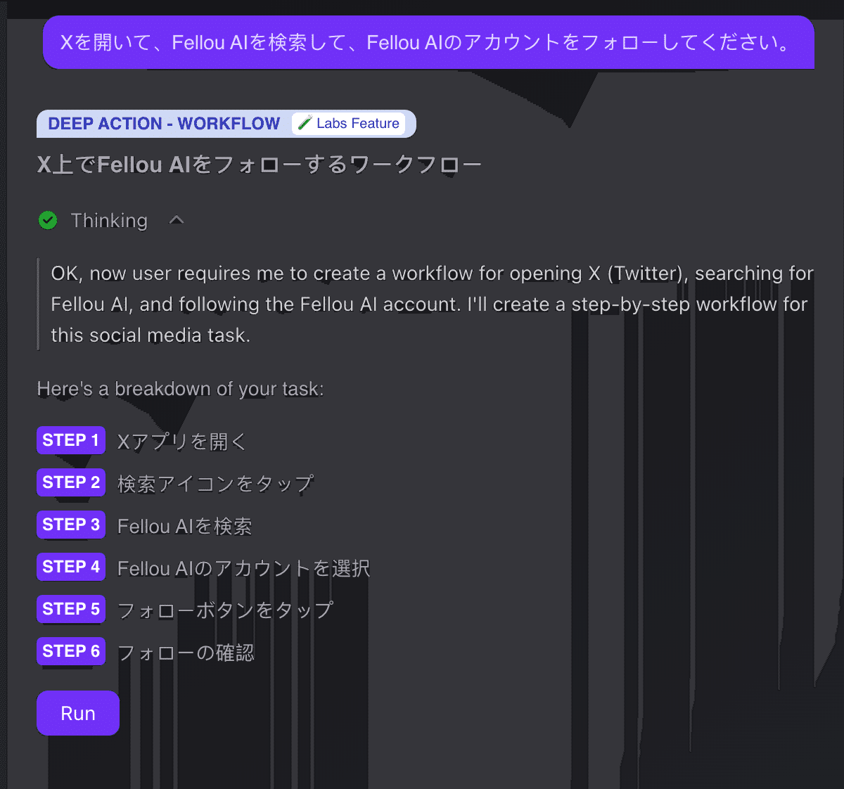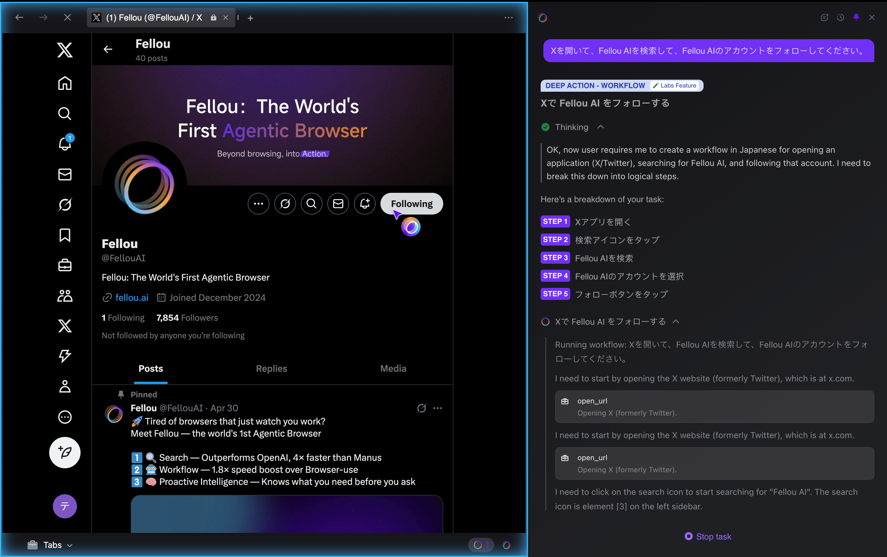 実際にワークフローを検討して、動作を実行して、XからFellou AIのアカウントのフォローを実施してくれます。