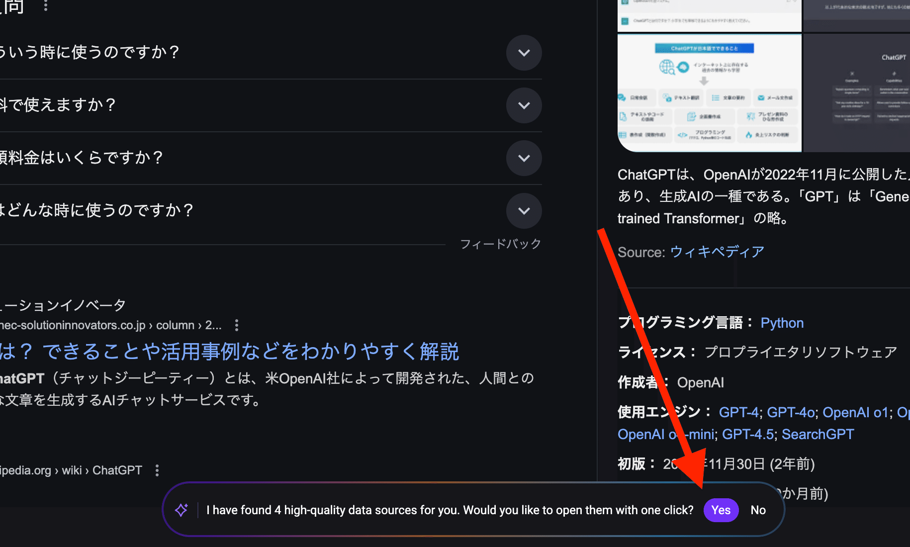 検索を実行すると普通にブラウザが開かれますが、Fellouの大きな特徴として、ブラウザの操作画面を認識していますので、ユーザーの操作を見て、次の動作を予測し、提案を行ってくれます。