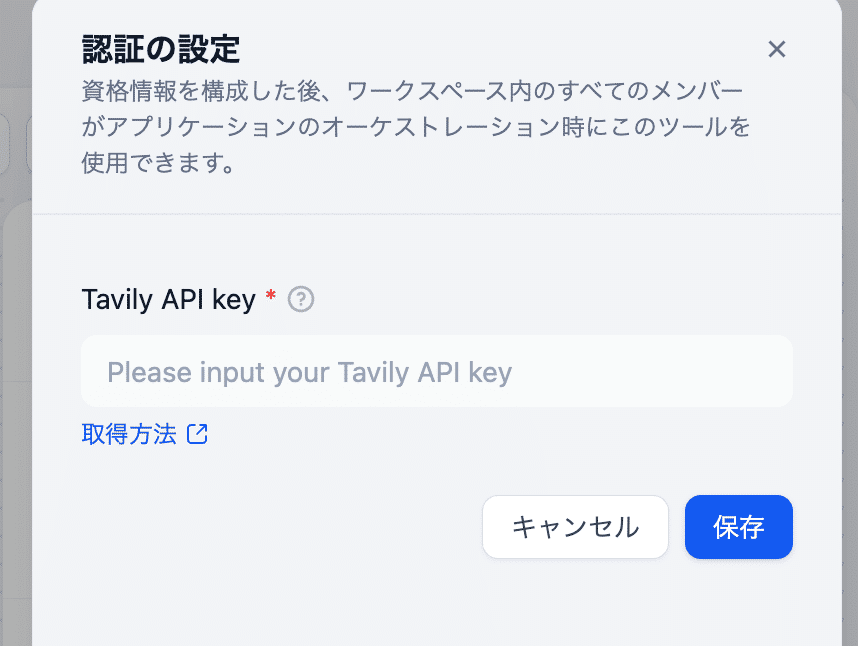 それぞれ、Difyのツールから開きます。すると未承認の場合、下記のような画面になりますので、APIキーをコピペして承認を済ませます。