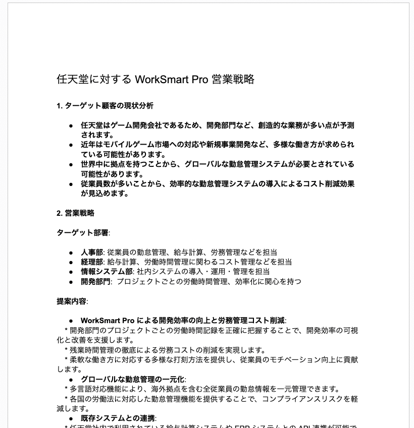 Googleドキュメントの作成: GASと連携して、生成された営業戦略を整理したGoogleドキュメントを自動で作成します。そして、ドキュメントのURLを出力します。