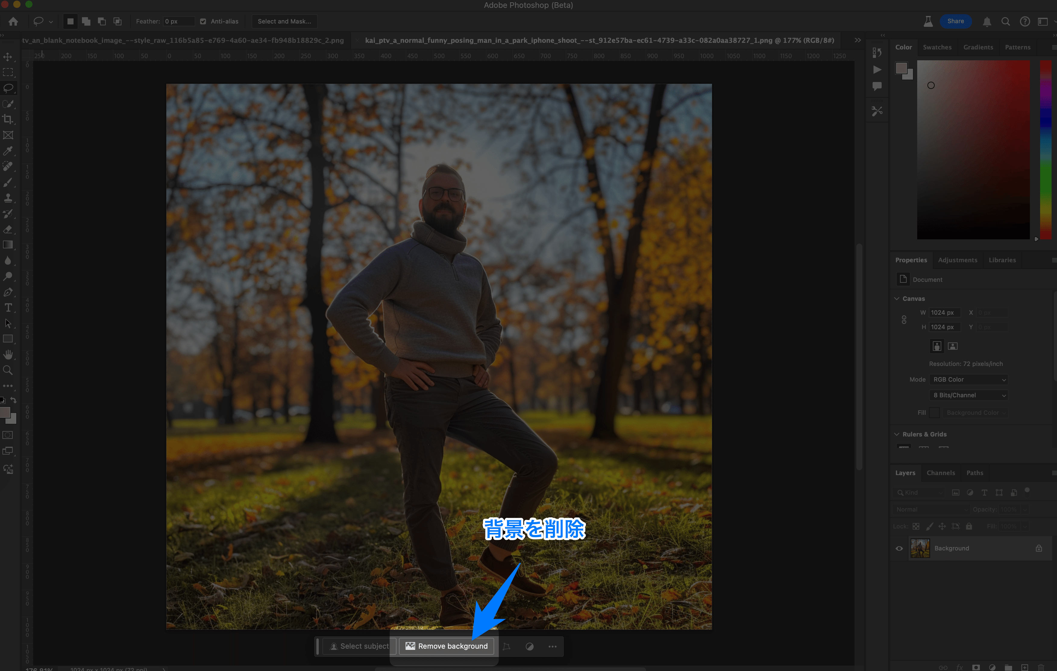 まず、背景を削除したい画像をPhotoshopで開きます。次に、画面下側のツールバーにある「背景を削除(Remove background)」ボタンをクリックします。これにより、画像の背景が自動的に削除されます。