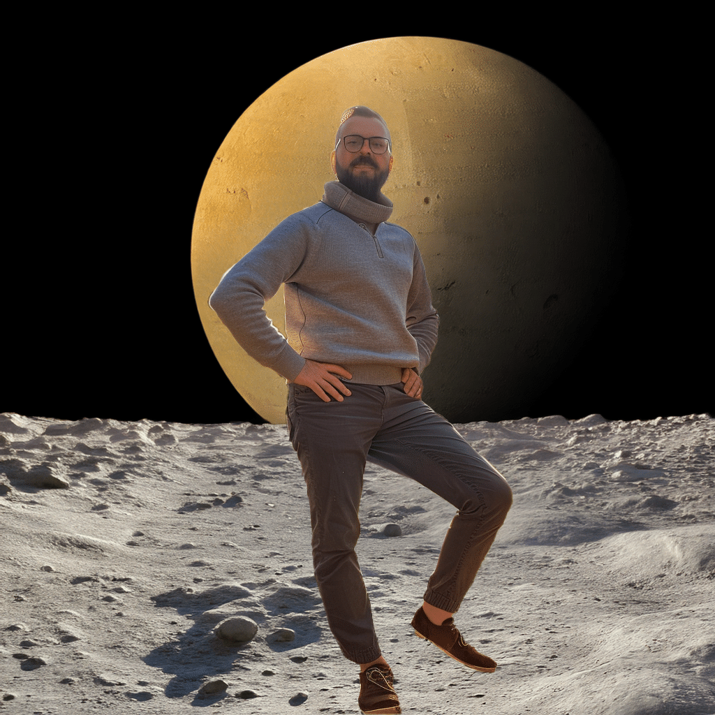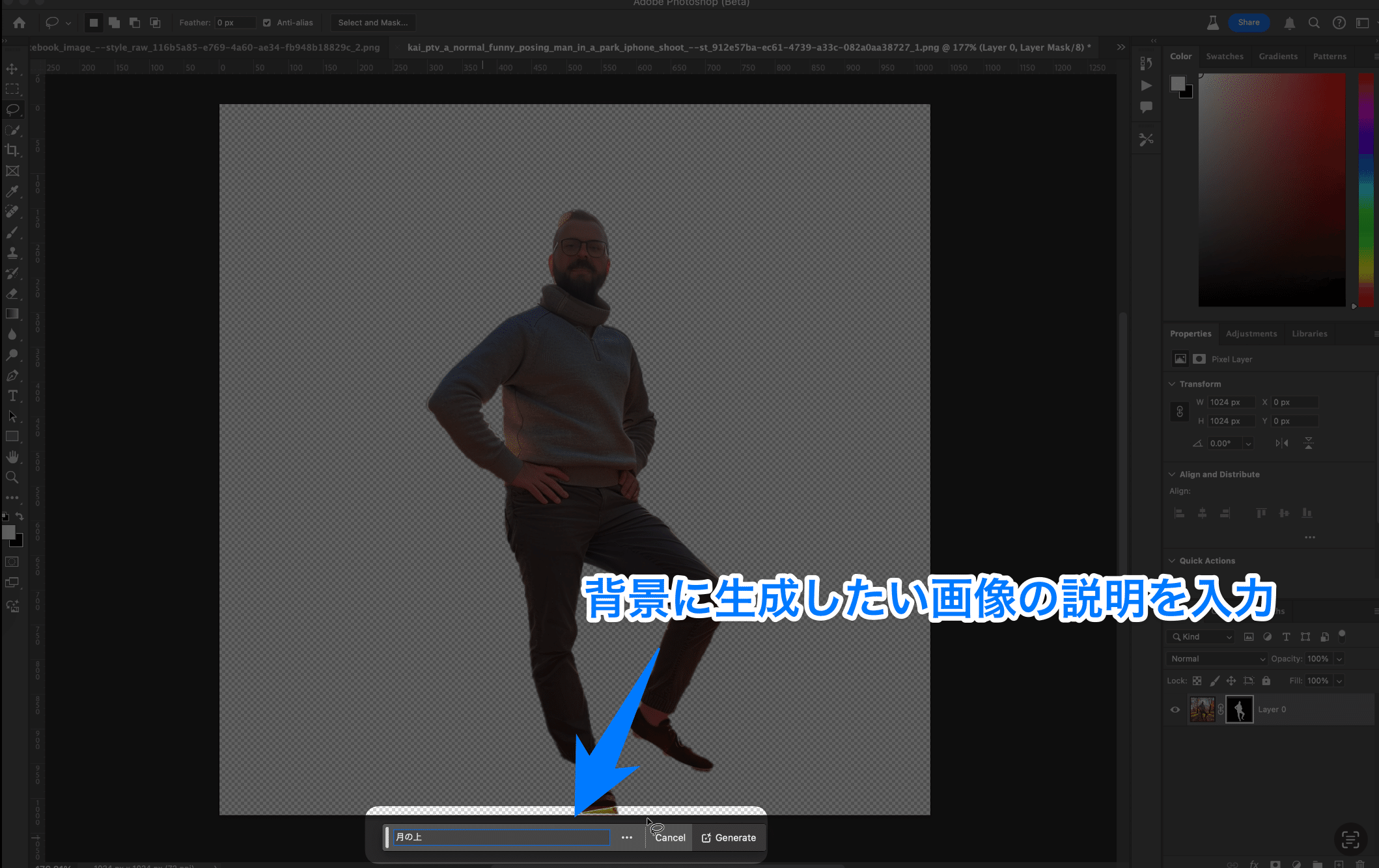 背景が削除された状態で、画面下部の「Generate background」欄に、新しく生成したい背景画像の説明(プロンプト)を入力します。ここでは例として「月の上」と入力してみましょう。
