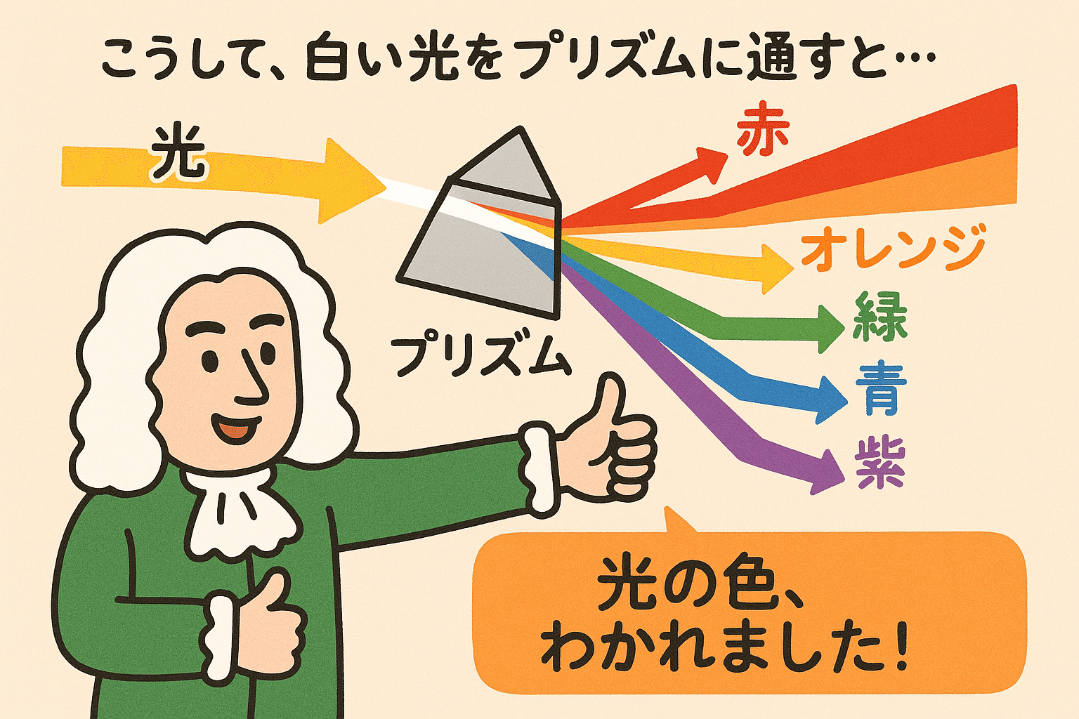 ユーモアを交えながら、ニュートンのプリズム実験を分かりやすく説明するカラフルな図解を、日本語も含めて描いてください。