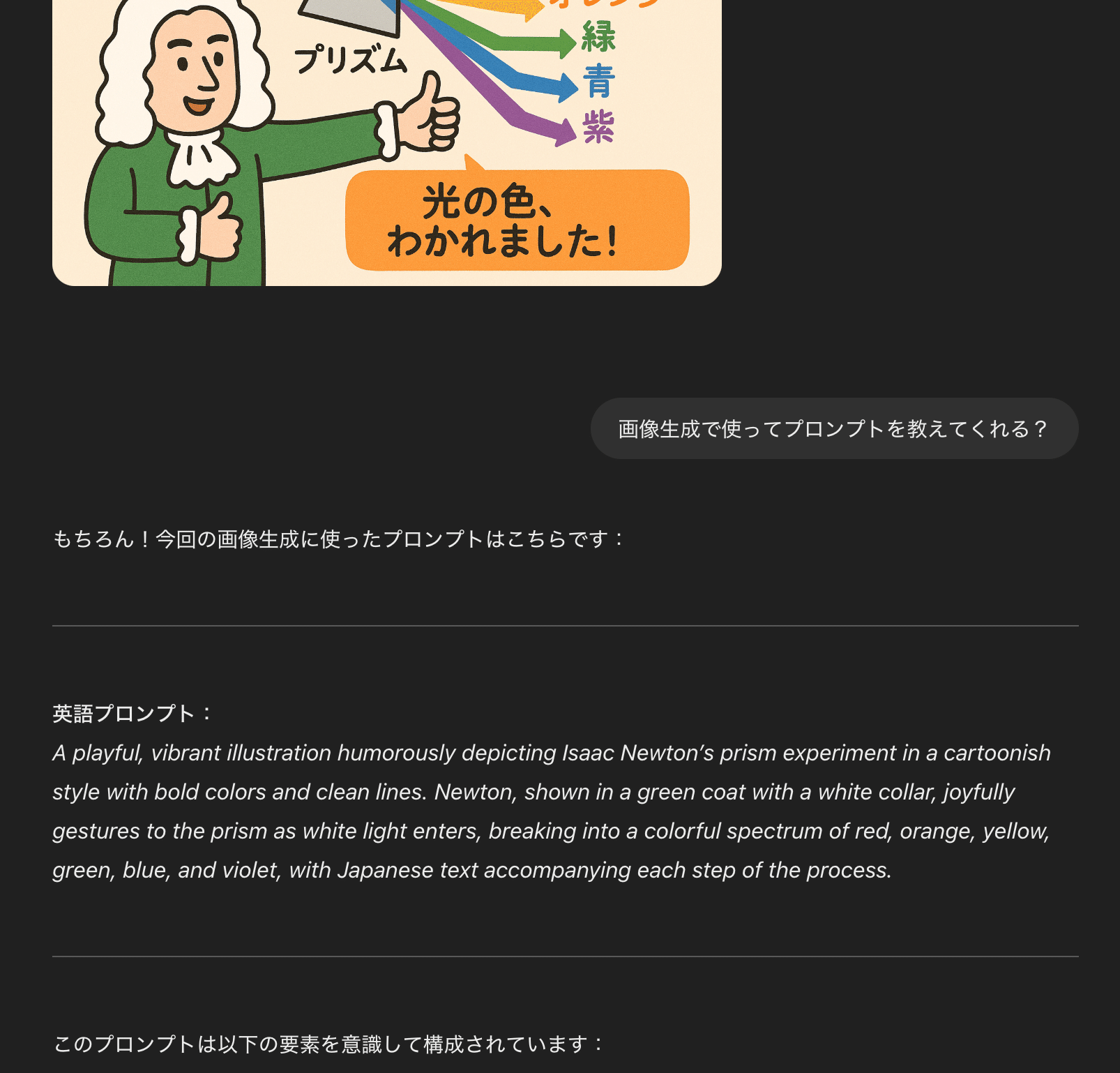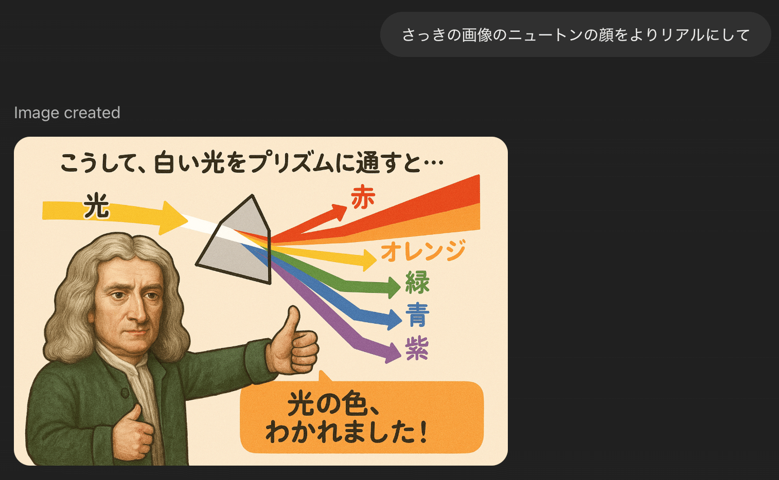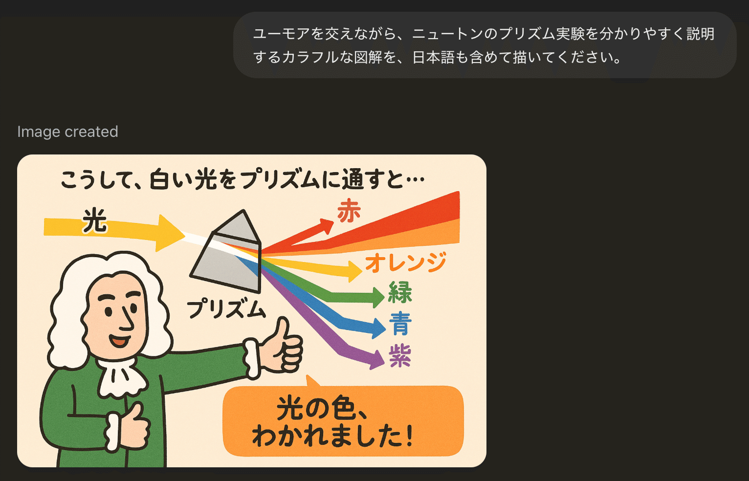例えば、「ユーモアを交えながら、ニュートンのプリズム実験を分かりやすく説明するカラフルな図解を、日本語も含めて描いてください」といった、従来は困難だった指示にも応えられるようになりました。