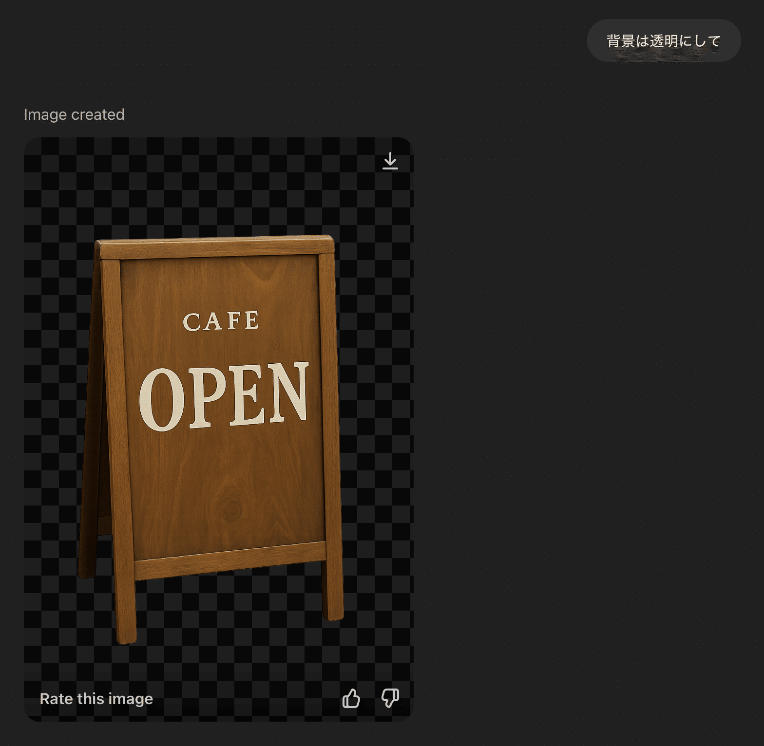 ※コツ・注意点: 非常に便利な機能ですが、意図しない部分まで透過されてしまうことも稀にあります。特に複雑な形状や、指示が曖昧な場合に起こりやすいようです。 個人的には、まず通常の画像を生成してから、次の指示で「この画像の背景を透過して」と追加で依頼する方が、安定して綺麗な透過画像を得られると感じています。