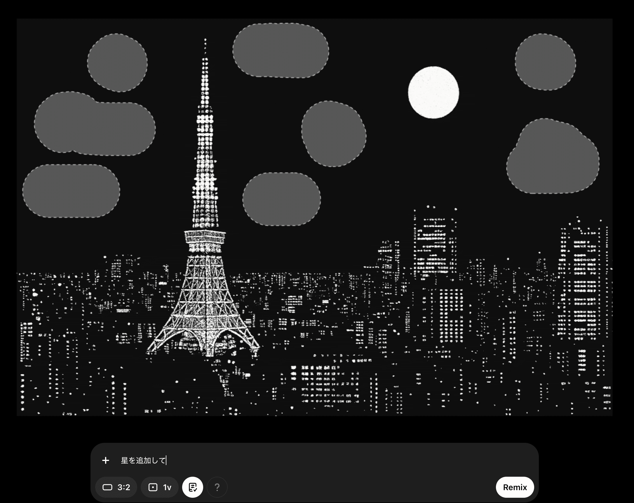 Remix機能: 生成した画像を開き、「Remix」ボタン(またはRキー) を使って、チャット形式で編集指示を加え、新しい画像を生成できます。これはChatGPT本体の部分編集機能に近い感覚で使えます。