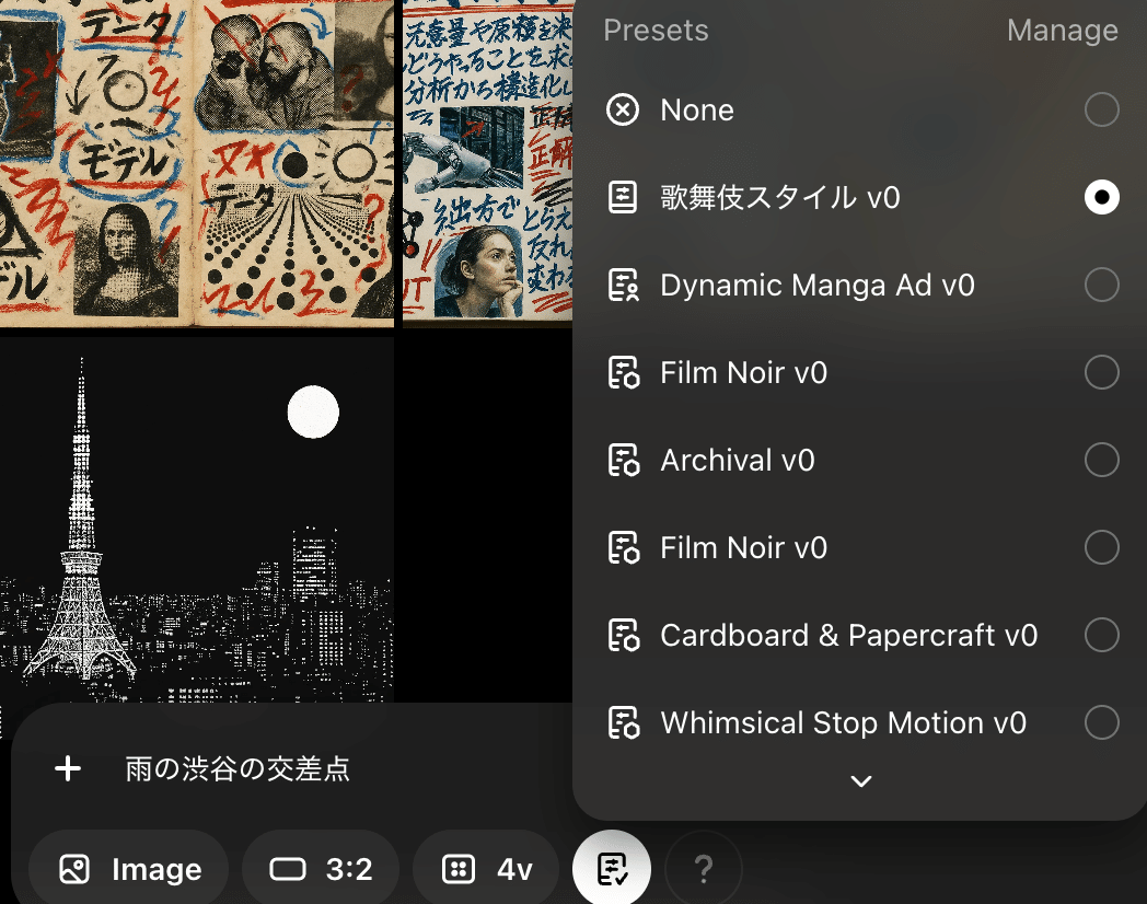 ③ 短いプロンプトを入力: スタイルに関する詳細な指示は選択したプリセットに含まれているため、プロンプトには「東京タワー」や「雨の渋谷の交差点」のように、主に被写体や状況を指定する短い言葉を入力するだけで、プリセットのスタイルが適用された画像が生成されます。