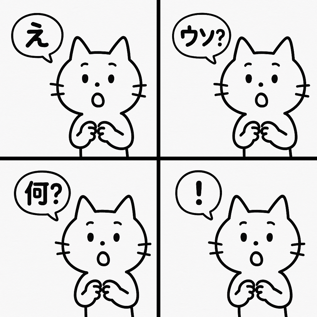 「1枚の画像を2x2のグリッドに分割してください。それぞれのマスに、LINEスタンプ風の、シンプルでクリーンな線画の白い猫キャラクターを同じ表情(少し驚いた顔)・同じポーズで描いてください。猫は小さなフキダシを持っており、その中に各マスで異なる、短い驚きや疑問を表す日本語のセリフ(例:「え?」「うそ?」「何?」「!」など、LINEスタンプに適したもの)を合計4種類、正確に入れてください。キャラクターデザインとポーズは全マスで一貫性を保つこと。各マスの背景は白。」