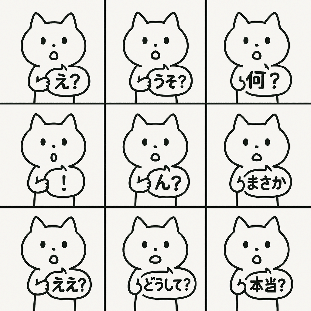 1枚の画像を3x3のグリッドに分割してください。それぞれのマスに、LINEスタンプ風の、シンプルでクリーンな線画の白い猫キャラクターを同じ表情(少し驚いた顔)・同じポーズで描いてください。猫は小さなフキダシを持っており、その中に各マスで異なる、短い驚きや疑問を表す日本語のセリフ(例:「え?」「うそ?」「何?」「!」など、LINEスタンプに適したもの)を合計9種類、正確に入れてください。キャラクターデザインとポーズは全マスで一貫性を保つこと。各マスの背景は白。