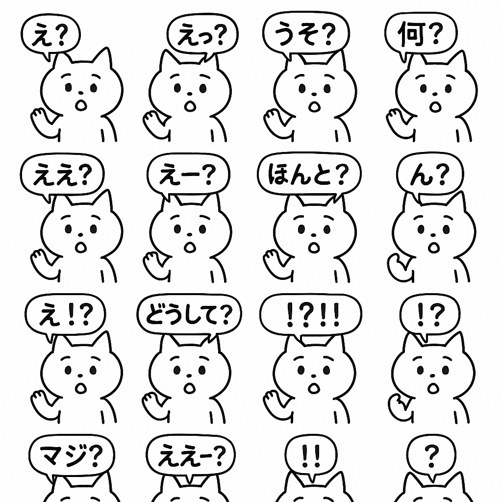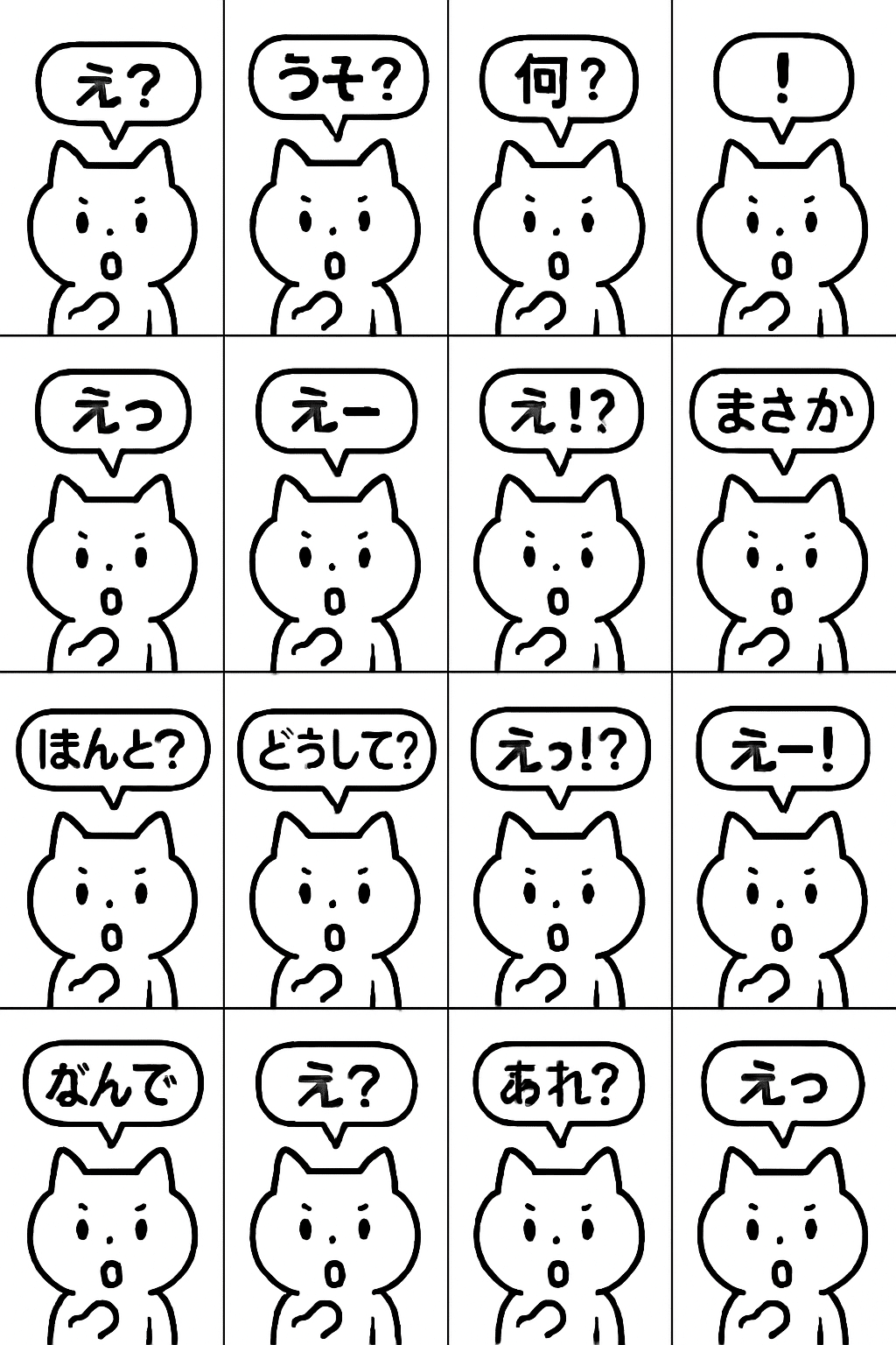 「1枚の画像を4x4のグリッドに分割してください。それぞれのマスに、LINEスタンプ風の、シンプルでクリーンな線画の白い猫キャラクターを同じ表情(少し驚いた顔)・同じポーズで描いてください。猫は小さなフキダシを持っており、その中に各マスで異なる、短い驚きや疑問を表す日本語のセリフ(例:「え?」「うそ?」「何?」「!」など、LINEスタンプに適したもの)を合計16種類、正確に入れてください。キャラクターデザインとポーズは全マスで一貫性を保つこと。各マスの背景は白。」