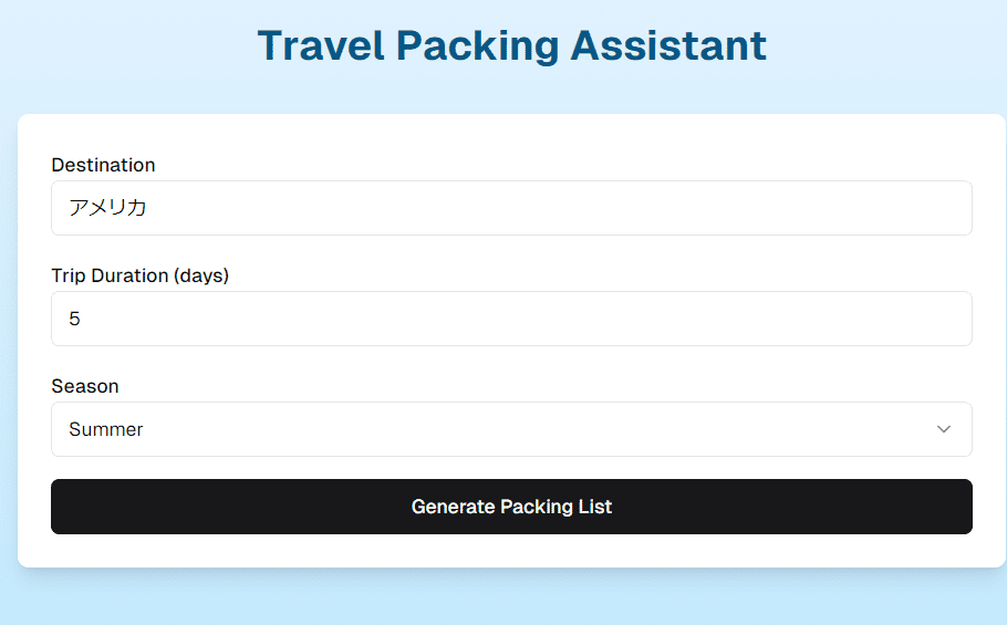 今回は旅行に便利なAIアプリを作るために、まずは簡単な機能から開発を始めます。例として荷物リスト作成支援をしてくれる、地名、滞在日数、季節を入力すると必要な荷物のリストをAIエージェントが提案してくれるというものを作ることにします。