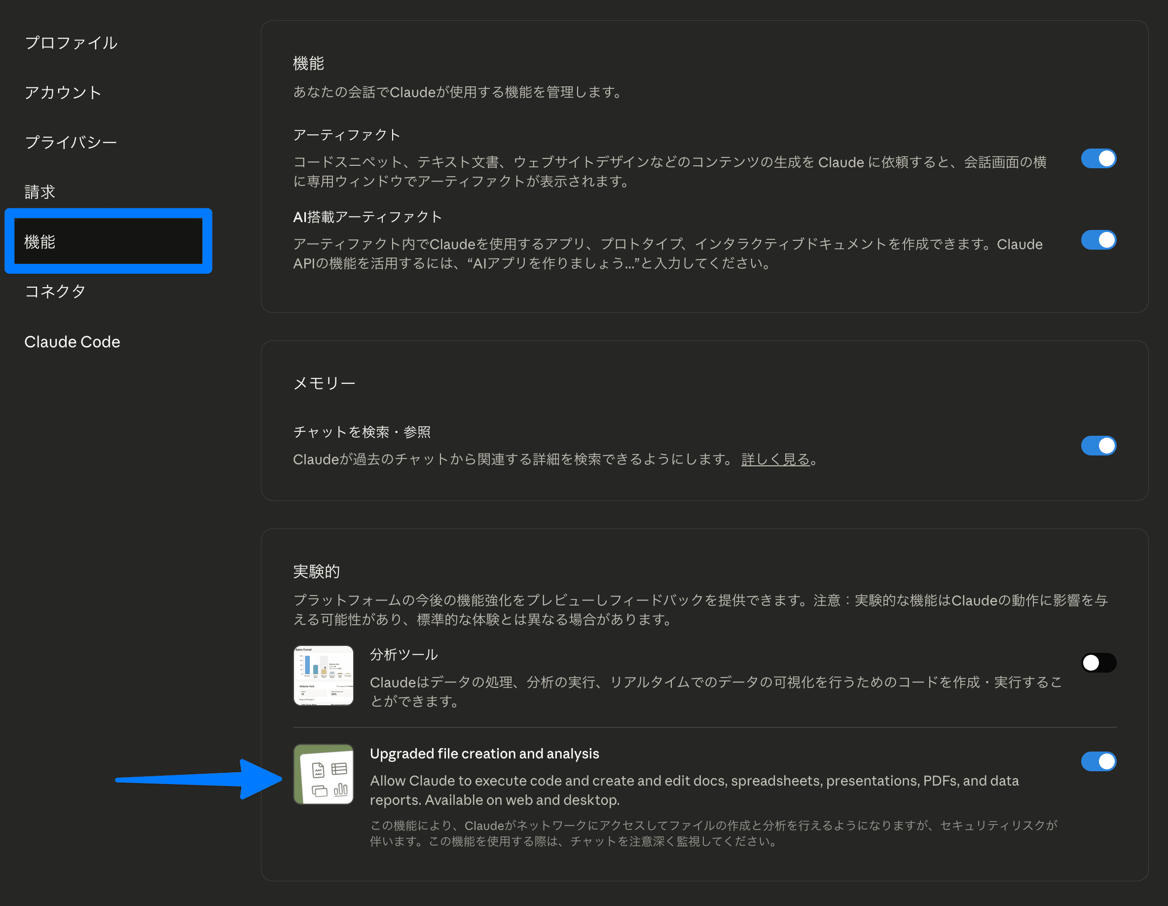まずは、今回追加された「ファイル作成・編集」機能の概要を見ていきましょう。ChatGPTにはPythonなどのプログラムを実行してファイルを作成する機能が以前から備わっていましたが、それに近い機能がClaudeにも実装されたイメージです。